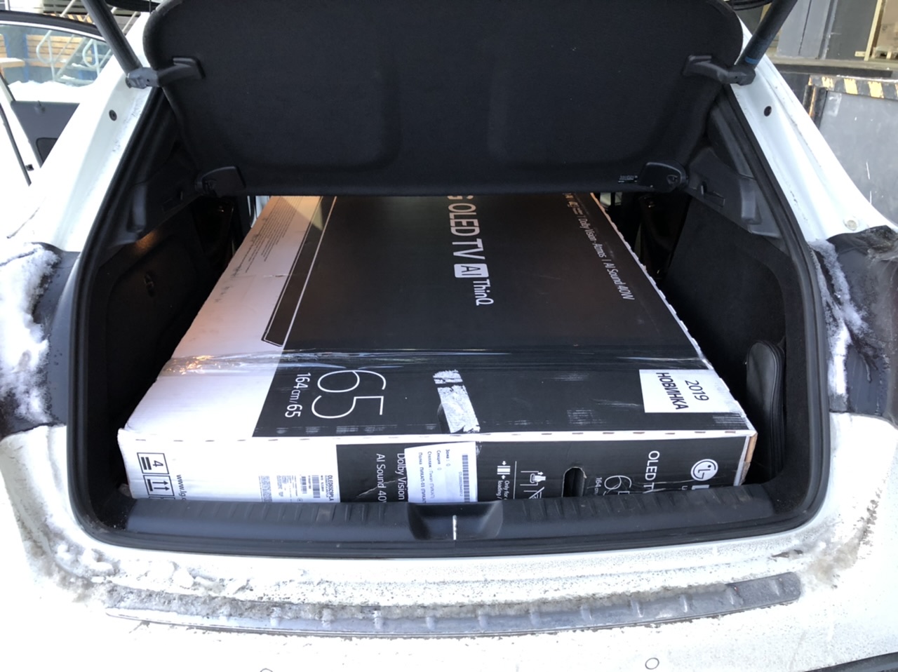 9 марта резко упавший рубль скорректировал планы замены ТВ - решил что нужно брать сейчас, к лету уже не понятно что будет с ценами, но дешевле скорее всего не будет. Выставил 55C7 на авито, через неделю нашелся покупатель и я стал мониторить цены на 65C9, уже во многих местах подросшие. Итого «серый» ТВ выходил 150 тыс. + 3-4 тыс. за доставку. В Мвидео был в наличии в моем городе, не витринный, за 180 тыс. До 16 марта были продлены промокоды на скидки, здесь на форуме добрый человек поделился кодом на 10 тыс. и я заказал 65C9. В Мвидео разрешили проверить ТВ до оплаты, его подняли со склада: серая коробка, дата производства 11.2019. Вместе с менеджером мы его распаковали, поставили на специальный стенд с мягкими держателями, я вставил заранее заготовленную флешку с заливками и роликами OLED TV Test Pack - панель в идеале, даже на 5-10-15% сером не было сильных полос. Запаковали, расплатился, попросил спустить к выдаче, куда подъехал на машине. Огромная коробка идеально влезла в компактный кроссовер!