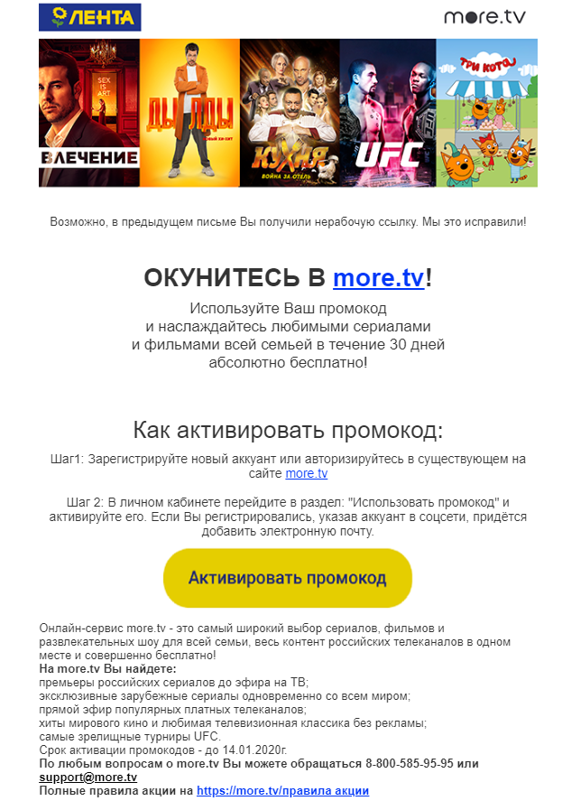 More TV (more.tv) — приложение для просмотра детского контента, телеканалов, фильмов, сериалов и развлекательных шоу на мобильном устройстве и тв с функцией Smart. Возможно просматривать на телевизоре и продолжить просмотр на смартфоне в дороге. Есть весь контент основных российских телеканалов, который возможно смотреть бесплатно.