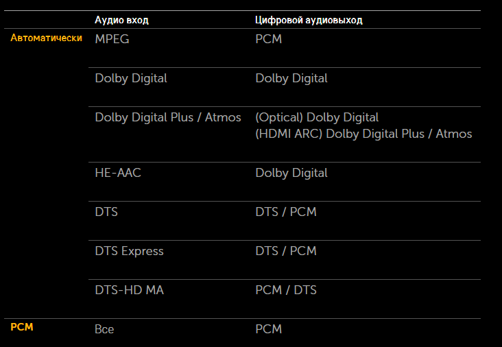А вот что ТВ может отдать наружу через цифровой аудиовыход Оптика/HDMI ARC в зависимости от входного звука