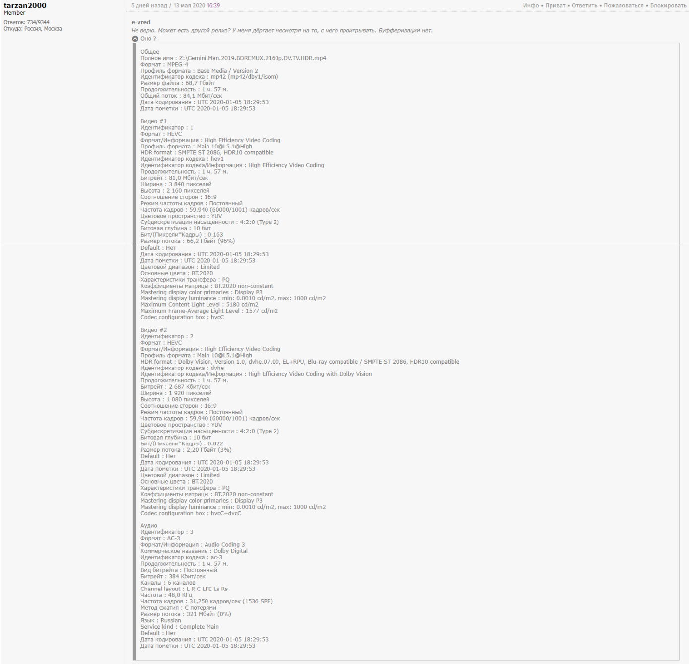 Видео № 1 ID: 1 Формат: HEVC Формат / Информация: Высокоэффективное кодирование видео Формат профиля: Главный 10@L5.1 @ High HDR формат: SMPTE ST 2086, HDR10 совместимый Кодек ID: hev1 Кодек ID / Информация: Высокоэффективное кодирование видео Продолжительность: 2 ч 10 мин Битрейт: 63,2 Мбит / с Ширина: 3 840 пикселей Высота: 2 160 пикселей Соотношение сторон дисплея: 16: 9 Режим частоты кадров: постоянный Частота кадров: 23,976 (24000/1001) кадров в секунду Цветовое пространство: YUV Подвыбор цветности: 4: 2: 0 (тип 2) Битовая глубина: 10 бит Биты / (пиксель * рамка): 0,318 Размер потока: 57,7 ГиБ (88%) Дата в кодировке: UTC 2019-09-05 18:05:48 Дата с меткой: UTC 2019-09-05 18:26:45 Цветовая гамма: ограниченная Цветовые праймериз: BT.2020 Характеристики передачи: PQ Матричные коэффициенты: BT.2020 непостоянный Освоение дисплея цветовых праймериз: Дисплей P3 Освоение яркости дисплея: мин: 0,0010 кд / м2, макс: 1000 кд / м2 Максимальный уровень содержания света: 1000 кд / м2 Максимальный средний уровень освещенности кадра: 358 кд / м2 Окно конфигурации кодека: hvcC
