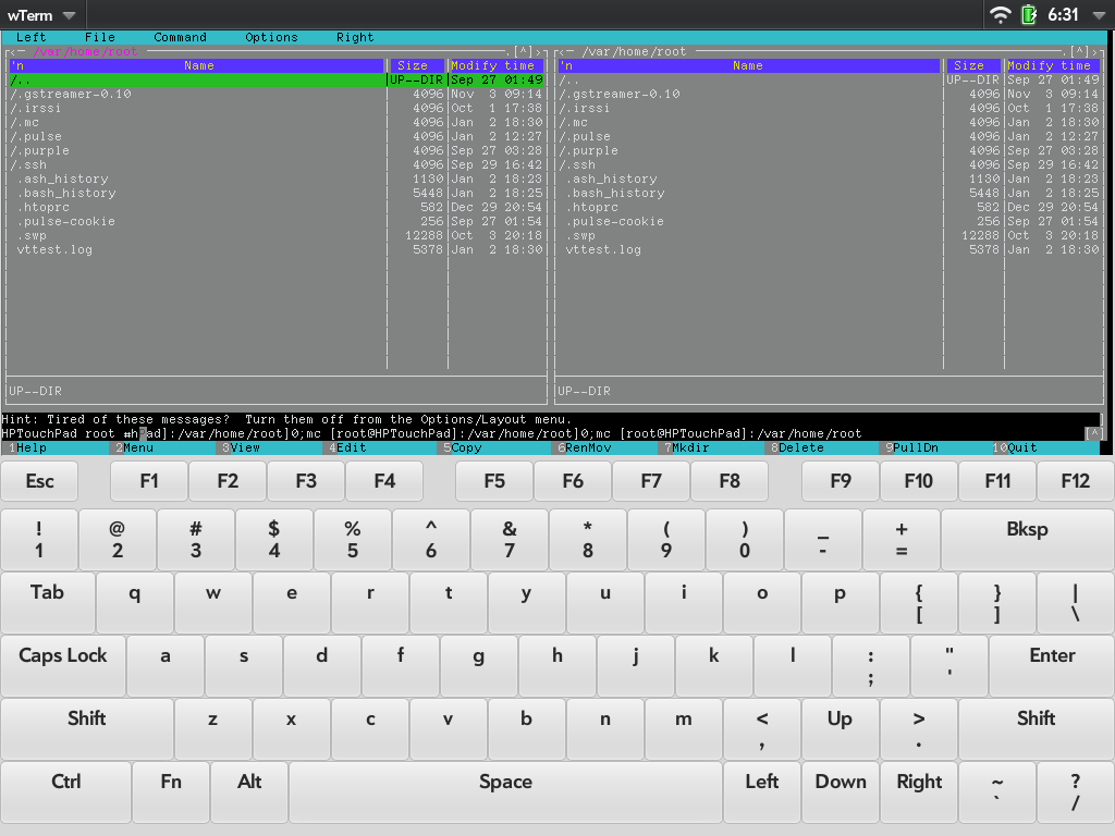 Описание: wTerm - это бесплатная программа, представляющая собой эмулятор linux-терминала и предназначенная для использования в среде webOS. wTerm является гибридным приложением (PDK/Enyo), оптимизированным для HP TouchPad (планируется поддержка телефонов ). wTerm поддерживает собственную виртуальную клавиатуру с 74 клавишами, среди которых Ctrl, Alt, Fn, ESC, стрелки и функциональные клавиши. wTerm также поддерживает аппаратное ускорение (то есть работает очень быстро) и настраиваемый размер шрифта.