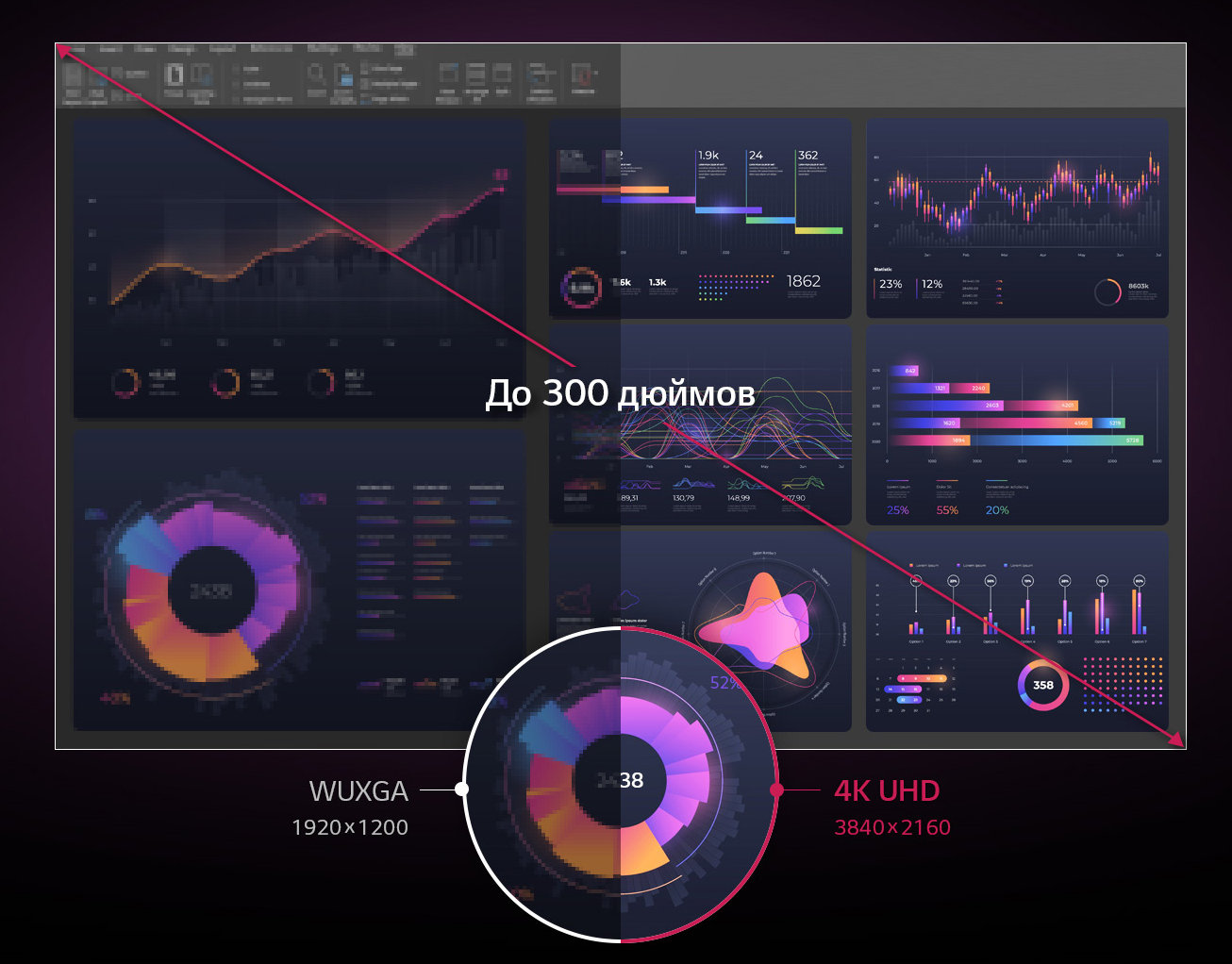 Диагональ проекции может варьироваться от 40 до 300 дюймов, что подходит для самых разных сценариев использования, таких как встречи с малым количеством участников или большие собрания в конференц-залах.