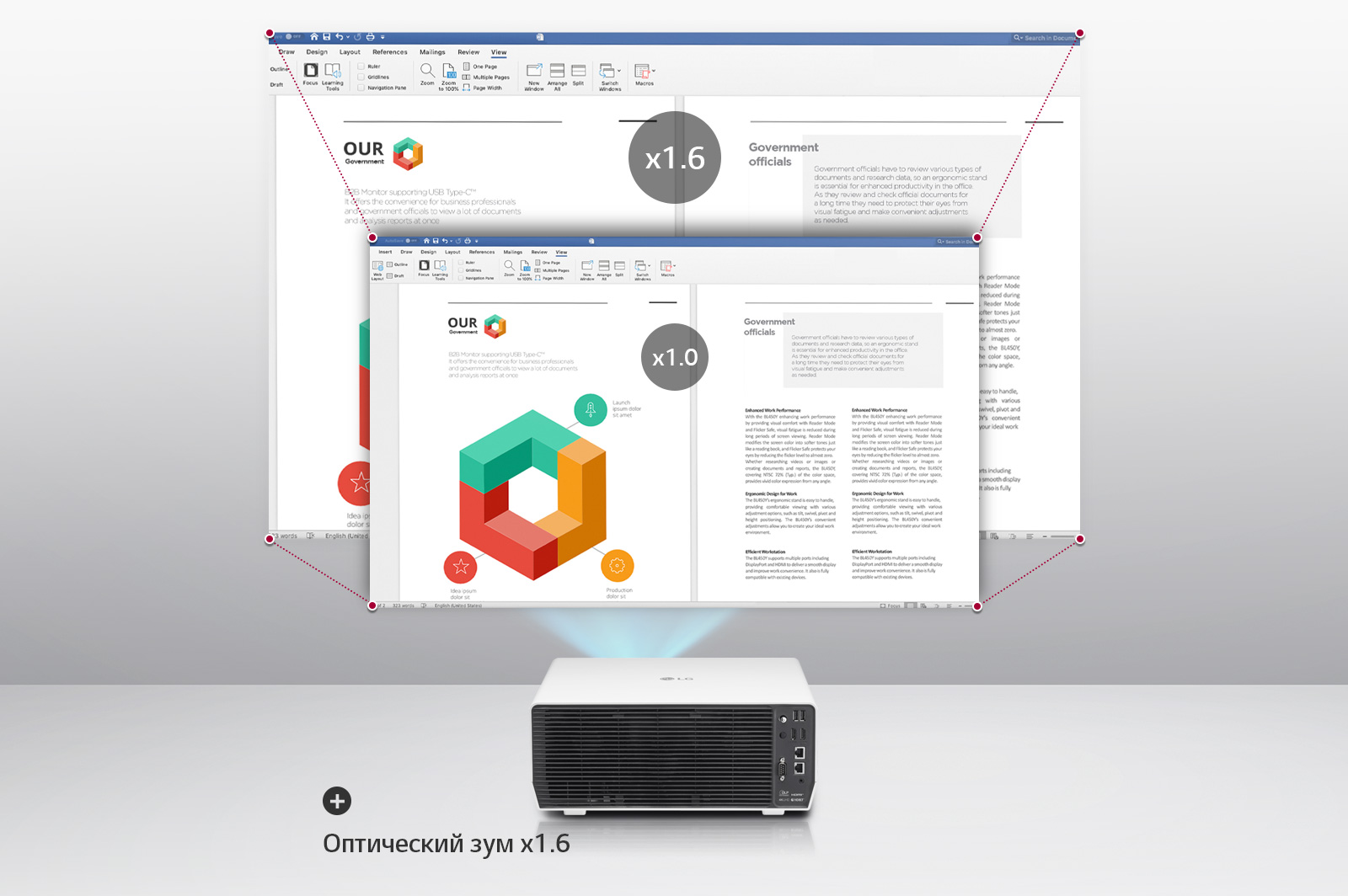 Оптический зум с коэффициентом увеличения х1,6 позволит обеспечить нужную диагональ при требуемом удалении от экрана.