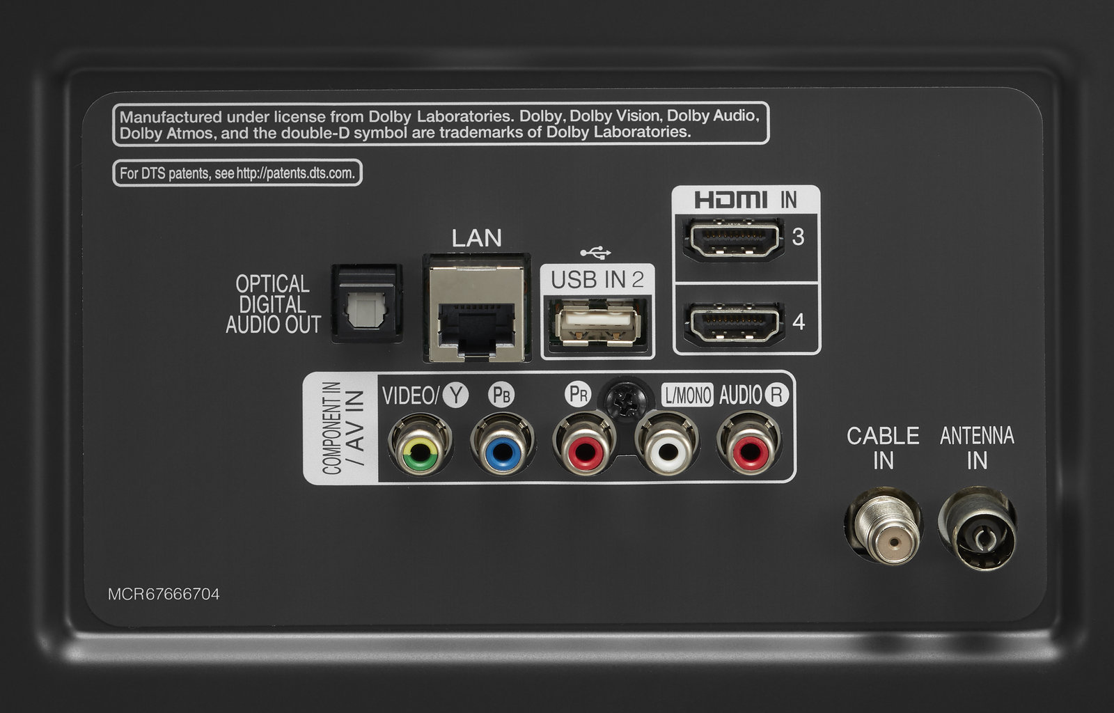 Задняя панель телевизора LG UN8100 оснащена следующими интерфейсами: два входа HDMI, 2 антенных входа (для спутникового и кабельного/эфирного ТВ), компонентный AV-вход (в версии для США), один порт LAN (со скоростью 100 Мбит/сек) и один порт USB (версии 2.0). Что касается аудио, то на этой же панели расположен только оптический аудиовыход, выход 3,5" для наушников отсутствует.