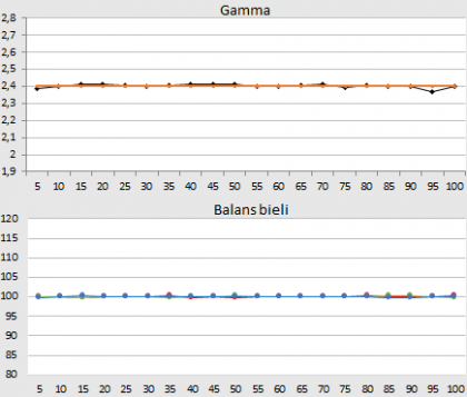 Все ошибки цветопередачи при оптимальных заводских настройках не очень велики, но их можно увидеть при ежедневном просмотре. Белый оттенок слишком зеленый, что приводит к появлению на экране оливкового пятна. Характеристика яркости, выраженная как гамма-функция, слишком высока. Это приводит к избыточному сжатию деталей темно-серого цвета (около черного).
