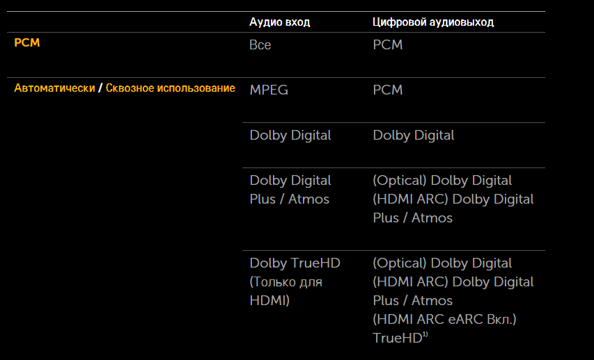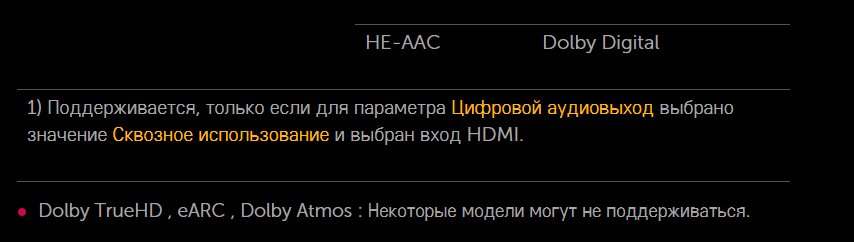 Неправильно, если говорить о звуке глобально, что-то при каких-то условиях все же можно (DD - всегда, DD+/Атмоs - всегда, если по ARC, DTS - в 2019 г. в., с внешнего источника по eARC в режиме сквозного использования и HD-звук проходит, теперь даже многоканальный PCM научили последними прошивками пропускать - этого нет в скринах из Руководства пользователя ниже). Вот как все это реализовано сейчас в для ТВ на webOS 4.5/5.0sp! nat писал(а):2. вывод звука на внешние устройства возможен через оптику и hdmi