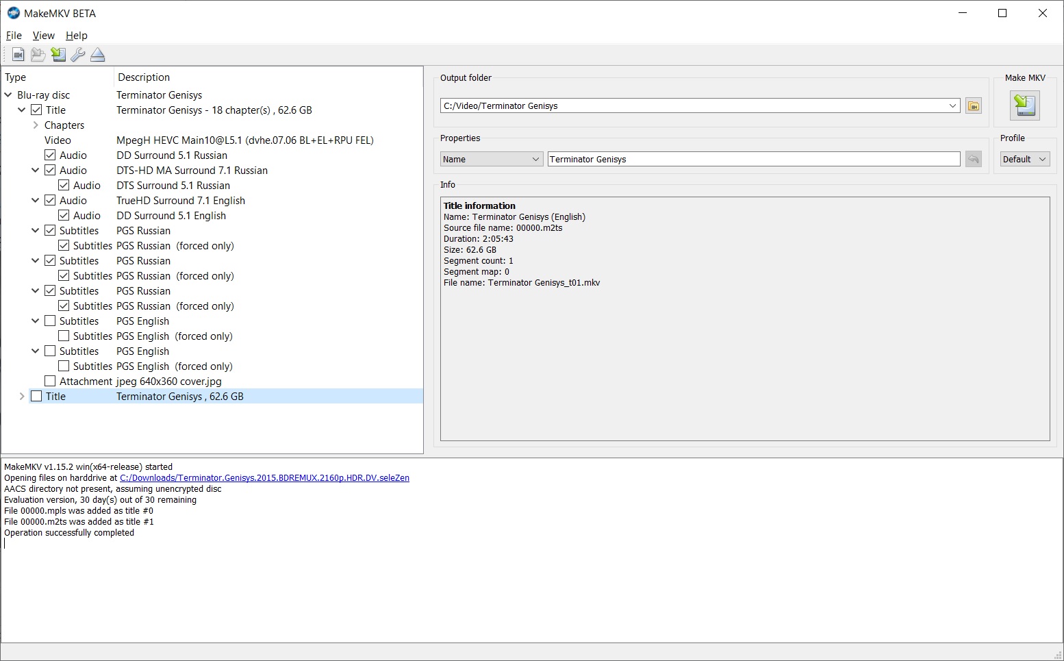 в проге выбираем index.bdmv на выбор два Title c главами и без, тут на свой вкус. Звуковые дорожки и субтитры выкинуть/вставить на свой вкус.