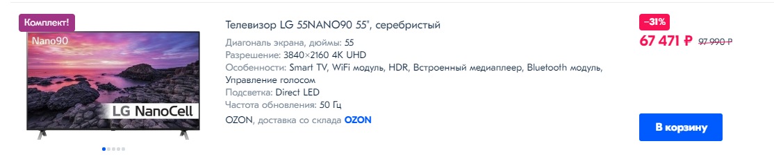 в теме Новые телевизоры LG со скидкой от официального магазина LG, + бесплатная доставка, ну и, если это будет не первая покупка с оплатой картой сбера, то озон по партнерской программе начислит 5% спасибками на картуалександр891 писал(а):55NANO906NA - 70 392руб
