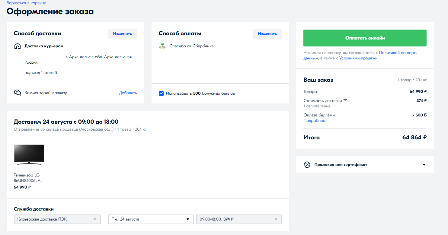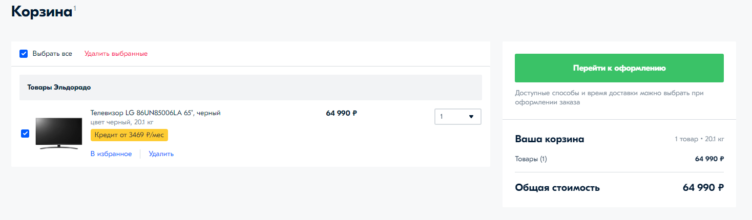 Лежит/висит в корзине, ждет онлайн-оплаты, кто хочет рискнуть - можем попробовать заказать в Ваш адрес (что придет по диагонали в реале - я не в курсе Анализировать пометку 65" и вес бессмысленно, т.к. они такие же, как и для аналога в М-Видео по втрое больщей цене)