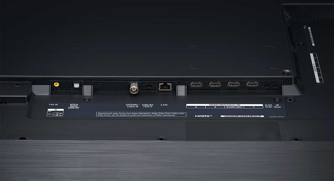 Нижняя панель телевизора LG NANO99 оснащена четырьмя входами HDMI v.2.1 (один из которых совместим с ARC и eARC), 2 антенными входами (для спутникового и кабельного/эфирного ТВ), одним портом LAN (со скоростью 100 Мбит/сек). Что касается аудио, то на этой же панели расположен оптический аудиовыход и выход 3,5" на наушники/акустику.