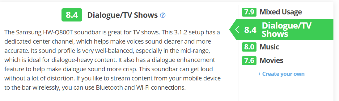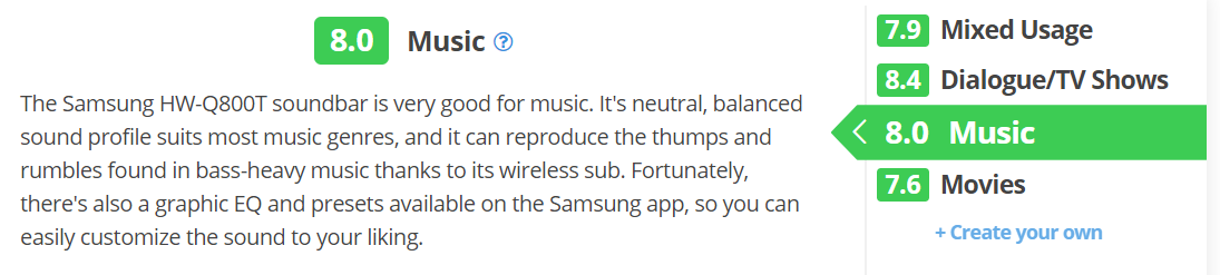 Объемное звучание Samsung HW-Q800T оставляет желать лучшего. Он микширует объемный контент в стерео, чтобы воспроизвести его, так что может звучать так, как будто ваш звук происходит перед вами, а не вокруг вас. Он также звучит довольно тяжеловесно.
