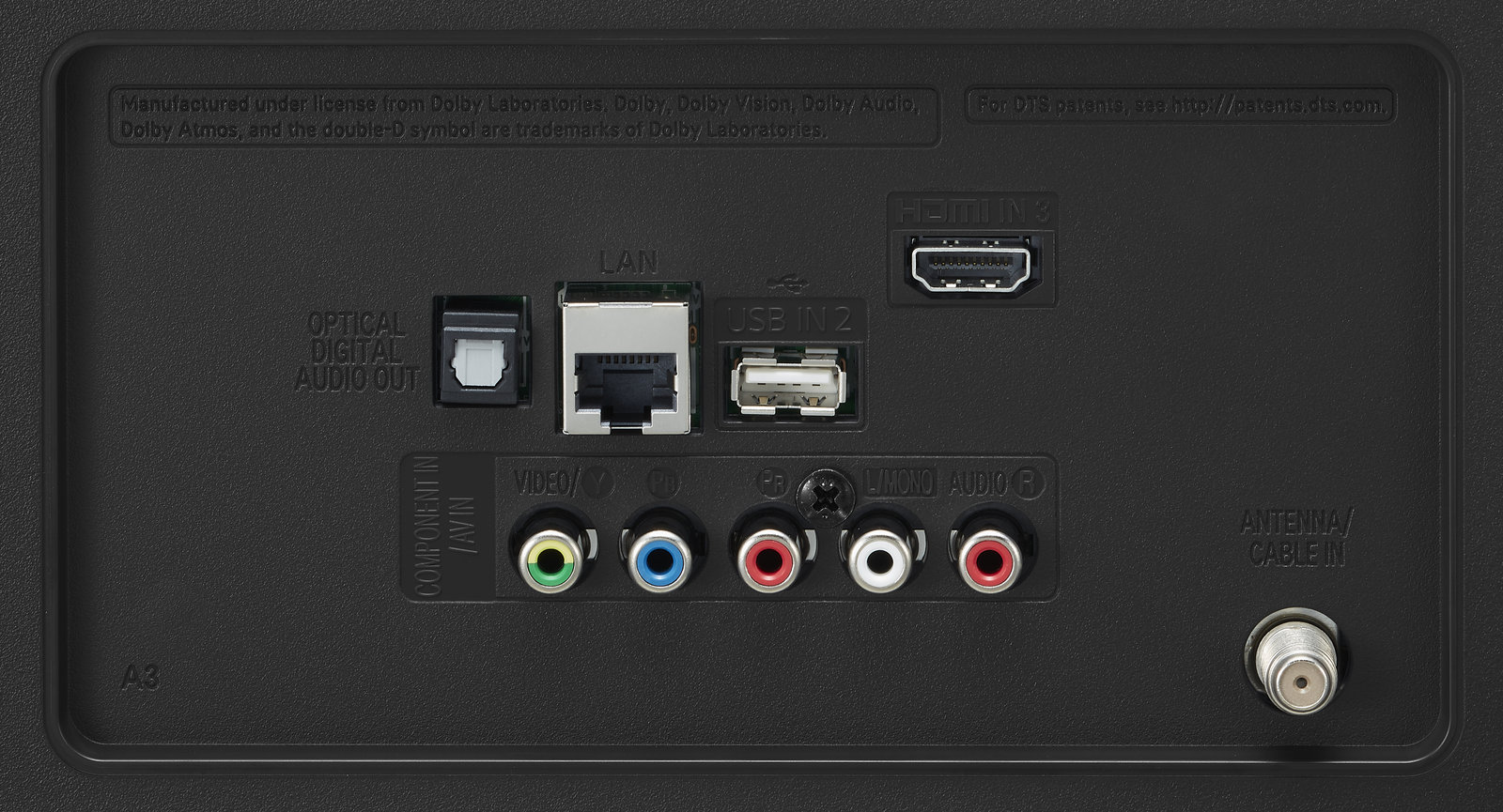 Задняя панель телевизора LG UN7100 оснащена следующими интерфейсами: один вход HDMI v.2.0, 2 антенных входа (для спутникового и кабельного/эфирного ТВ), компонентный AV-вход (в версии для США), один порт LAN (со скоростью 100 Мбит/сек) и один порт USB (версии 2.0). Что касается аудио, то на этой же панели расположен только оптический аудиовыход, выход 3,5" для наушников отсутствует.