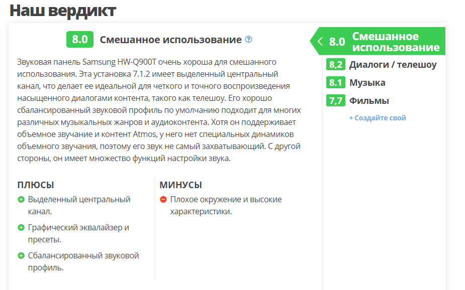 Звуковая панель Samsung HW-Q900T - это превосходно выглядящая конфигурация 7.1.2 со специальным сабвуфером. У него очень нейтральный звуковой профиль по умолчанию, широкая и сфокусированная звуковая сцена, а также множество параметров настройки звука и возможностей подключения. Производитель заявляет, что голосовой помощник Alexa встроен в панель, но мы не тестируем это. Он также поддерживает объемное звучание и контент Dolby Atmos, хотя в нем отсутствуют сателлитные динамики, поэтому он не обеспечивает наиболее захватывающее впечатление от прослушивания. С другой стороны, он может быть громким, а его универсальная общая производительность должна понравиться множеству разных слушателей.