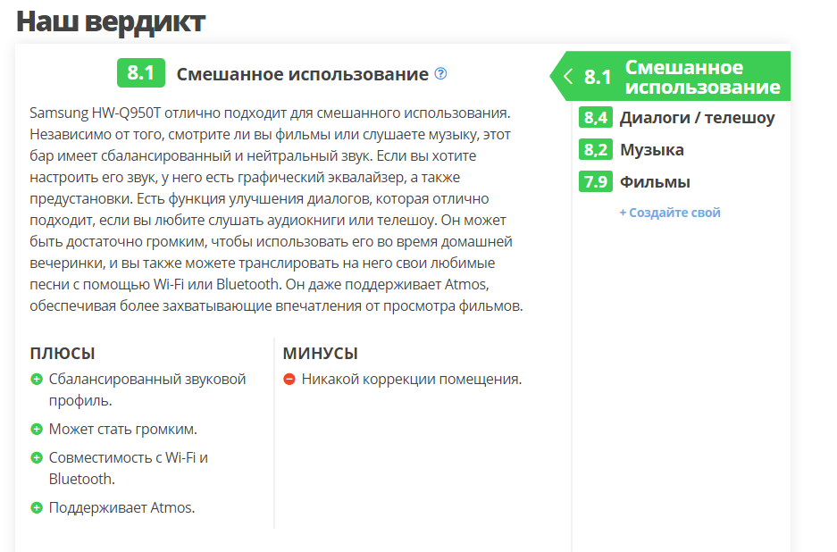narpol писал(а):Лично под себя (свое понимание значимости параметров) сформировал таблицу по подбору саундабара для использования в системе ДК исключительно на кинематографическом контенте (Телешоу/Диалоги включено лишь как неотъемлемая составляющая в использовании, в т. ч. имеющая значение для диалогов героев в кадре, Музыка, как аспект, вообще не вносилась - не мой сценарий для музыкалки, нужны другие сетапы - ИМХО), отсортировано именно по оценке ФИЛЬМЫ (может кому пригодится) https://www.rtings.com/soundbar/tools/table/37544