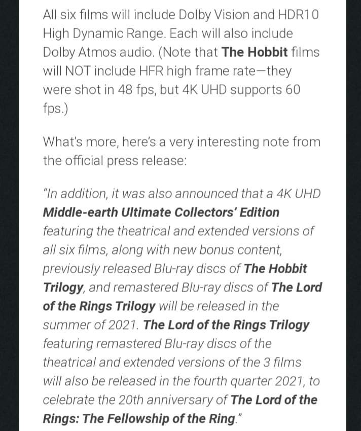 In addition, it was also announced that a 4K UHD “Middle-earth” Ultimate Collectors’ Edition featuring the theatrical and extended versions of all six films, along with new bonus content, previously released Blu-ray discs of The Hobbit Trilogy, and remastered Blu-ray discs of The Lord of the Rings Trilogy will be released in the summer of 2021.The Lord of the Rings Trilogy featuring remastered Blu-ray discs of the theatrical and extended versions of the 3 films will also be released in the fourth quarter 2021, to celebrate the 20th anniversary of The Lord of the Rings: The Fellowship of the Ring.