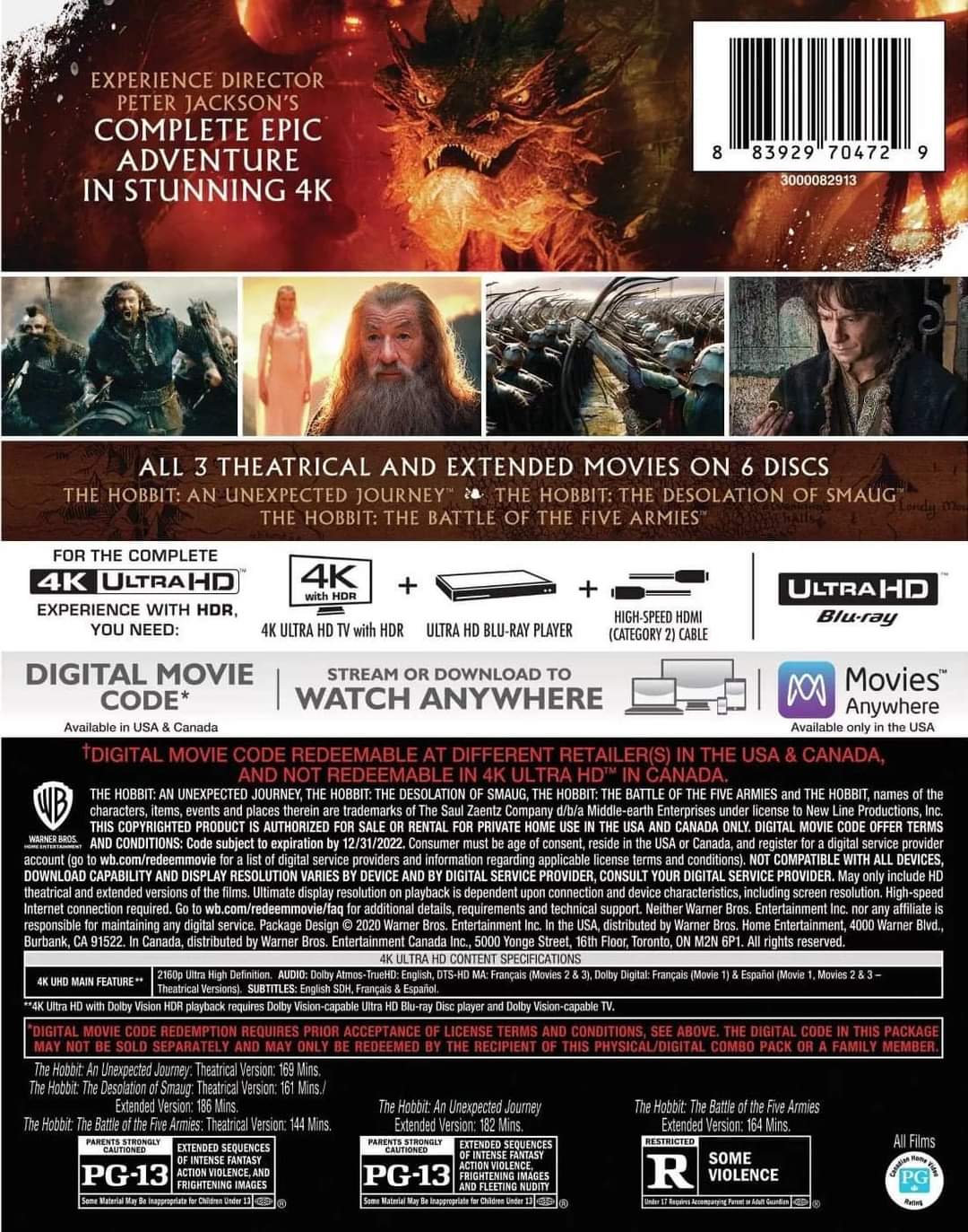 The Hobbit Trilogy and The Lord of the Rings Trilogy will be available on 4K Ultra HD for $89.99 Expected Retail Price.