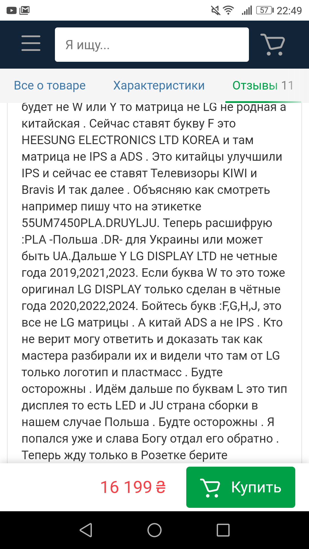 Помогите разобраться. Уже голову сломал. Купил телевизор LG 55UM7510PLA "серый" вроде как польской сборки. При получении осмотрели, так как помещение не сильно большое и места не очень в пункте выдачи и времени для осмотра мало, толком рассмотреть не удалось, вроде норм. Привезли домой и тут началось... Во-первых сам Код: BEUGLJP. Что смутило, это буква "G" в коде - не понятно что за тип матрицы, точной информации на форуме нет (вроде как ADS, а вроде бы и нет по другой информации), с ней явно что-то не то визуально при взгляде с разного ракурса хоть чуть-чуть на 15 см отойди в сторону, экран как хамелеон меняет цветность на черном фоне похоже на glow-эффект. Если смотреть на телевизор строго по центру, то у него левая сторона светлее правой, если сместиться ближе к левому краю, то цвет выравнивается немного с левого края в темный. Заметны засветы от засветки по всему периметру экрана на фото их словить сложно, но они явные. Матрица как на VA со стороны заметно выцветает при просмотре, что на IPS (а в этой модели должна быть именно она, по заявлениям производителя), видеть странно. На белом и цветных тестовых фото все хорошо. Ещё смутил момент в Коде: BEUGLJP - это EU, я что-то не нашел на форуме для какой страны эта модель... По отзывам в интернете и обзорам, все в восторге от качества картинки и от самого экрана. Я не особо придирчив к таки деталям чтобы рассматривать каждое пятнышко на экране, так как есть модель LG 13 года и там тоже видны засветы на черном и не равномерность заливки на белом фоне, но экран как хамелеон не играет оттенками при смещении головой угла обзора: вверх, вниз, влево, вправо. Единственное в этом телевизоре - шикарный звук))) Что подскажете - брак или всё-таки палёнка какая-то по типу "корейского"?