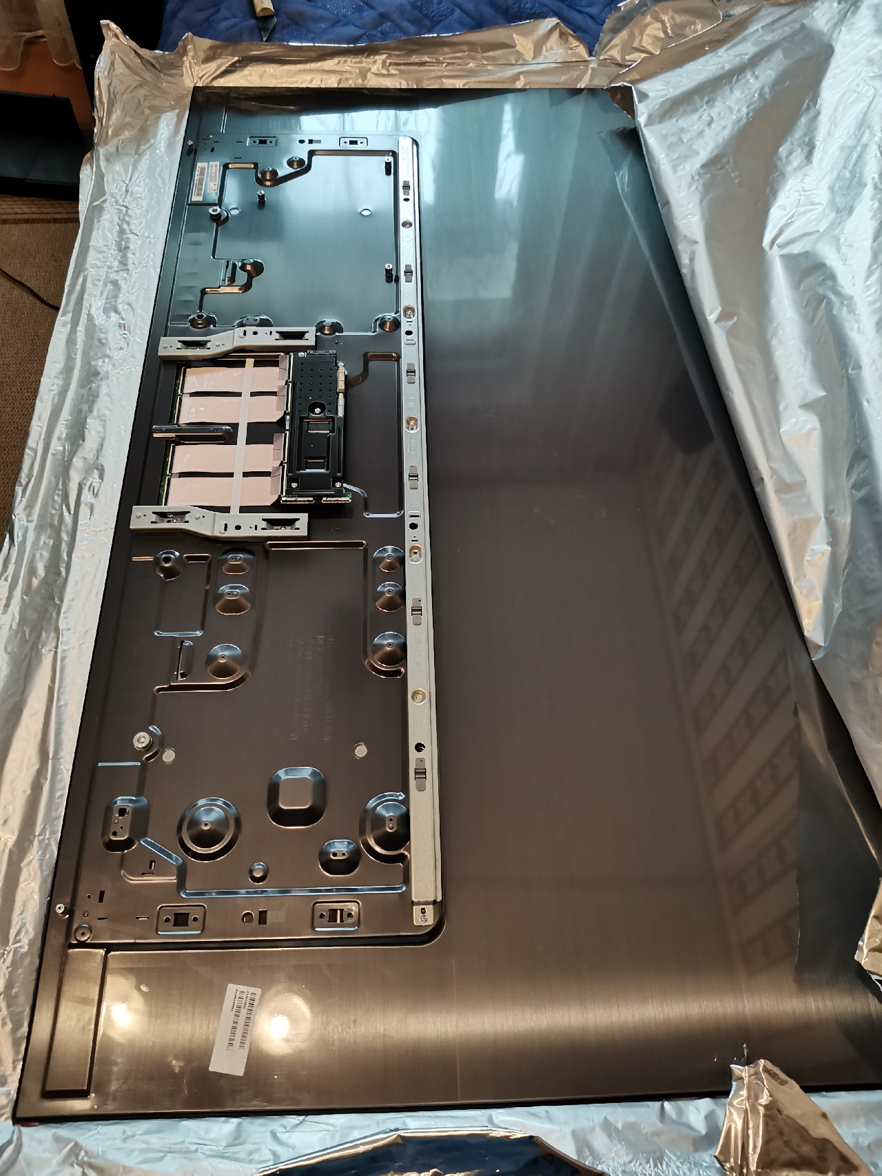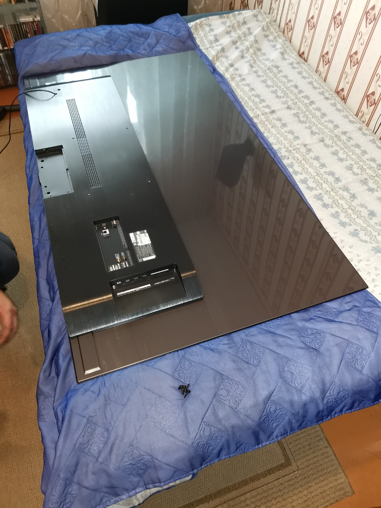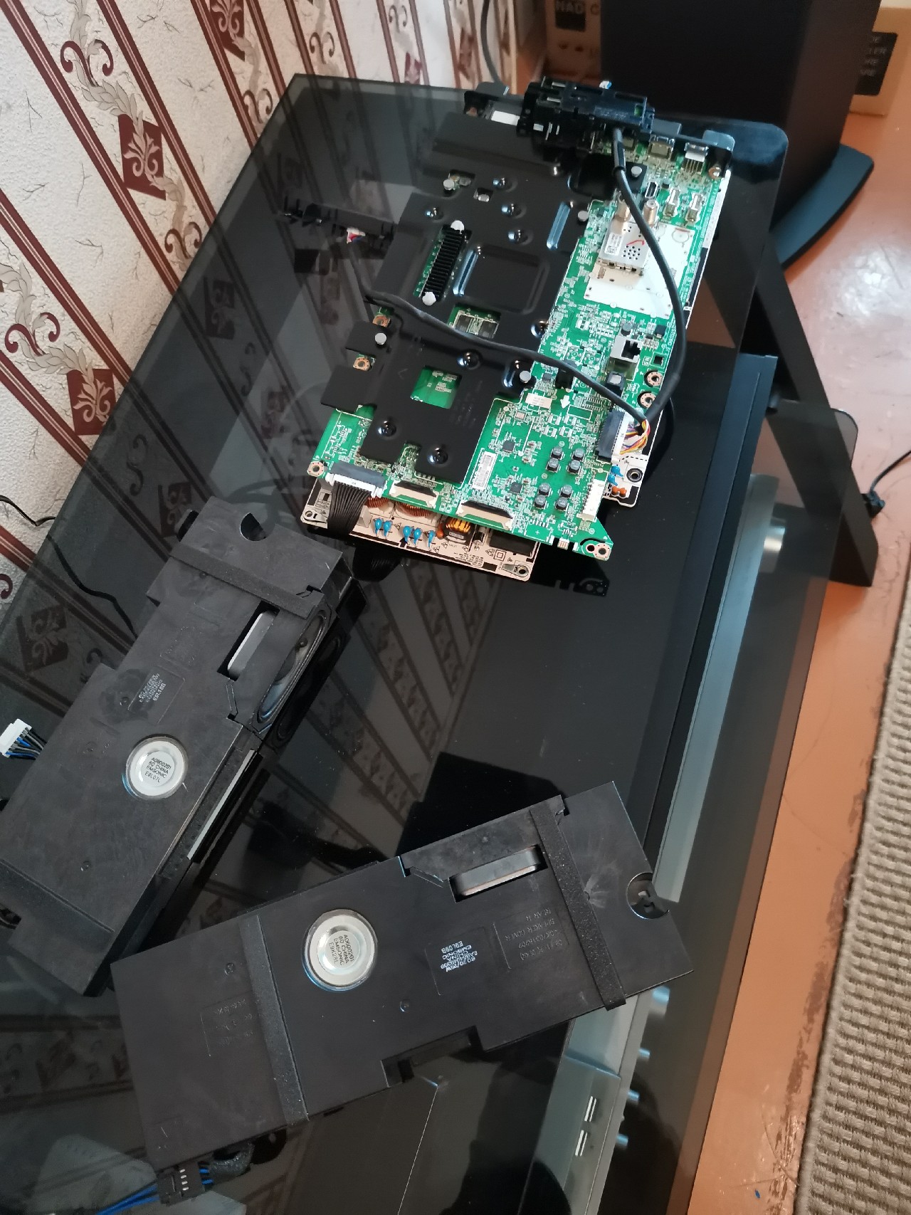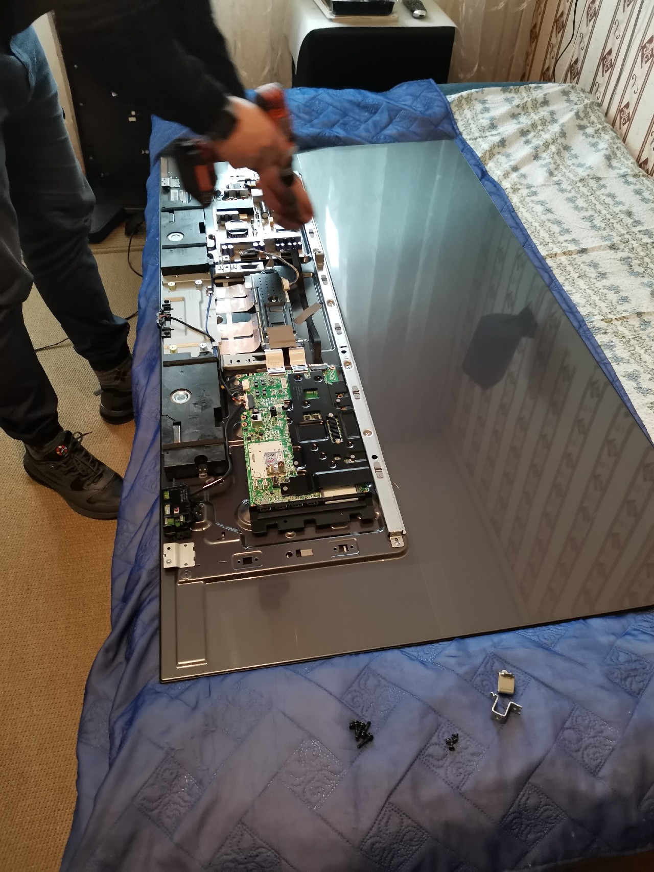 Затем две недели ожидания и мастер уже с напарником и новой матрицей в коробке снова у меня. Панель была новая, в фирменной коробке LG и запаяна в антистатический серебристый пакет, вроде тех, в которых поставляются новые материнские платы или видеокарты. Сама замена довольно несложная и сводится к снятию пары плат, динамиков и блока питания и их переносу на новую панель. На все ушло минут 15.