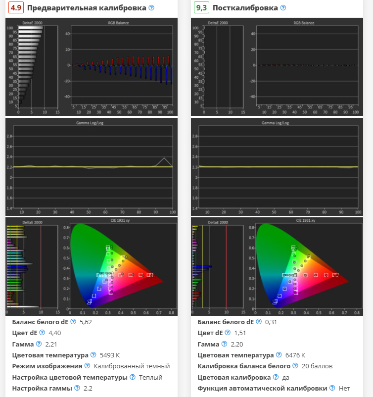 Точность после калибровки выдающаяся. Остальные неточности трудно обнаружить без помощи колориметра, а цветовая температура очень близка к целевой 6500K.