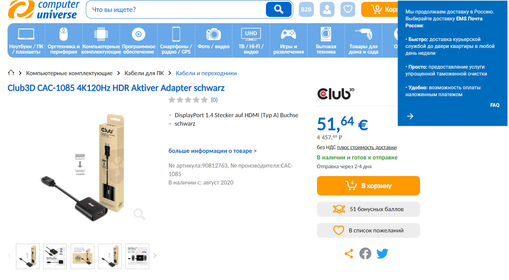 А еще купить Club3D CAC-1085 4K120Hz можно на немецком Computeruniverse, если кому-то удобнее чем амазон.