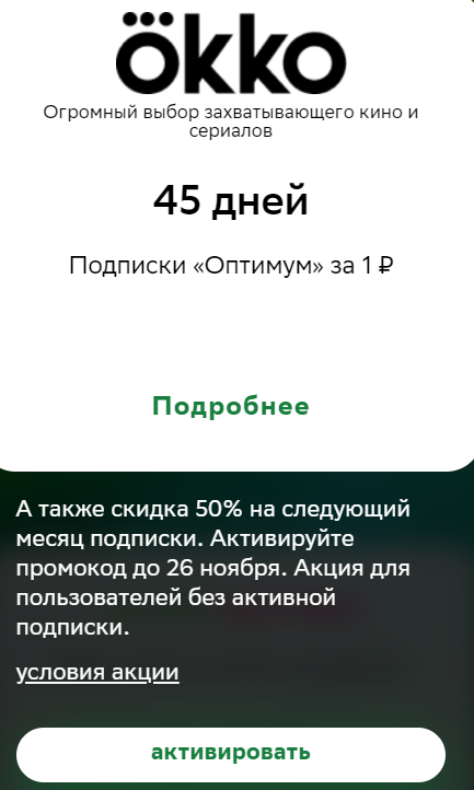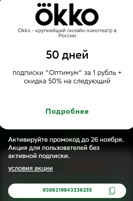 Новый промокод на 60 дней подписки в онлайн-кинотеатр Okko