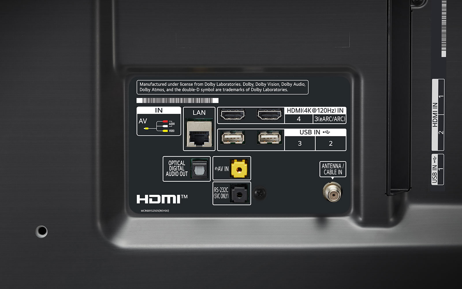 Задняя панель телевизоров линейки NANO85 оснащена двумя входами HDMI v.2.1 (один из которых совместим с ARC и eARC), двумя разъемами USB 2.0, компонентным AV-входом (только в версии для США), 2 антенными входами (для спутникового и кабельного/эфирного ТВ) и одним портом LAN (со скоростью 100 Мбит/сек). Что касается аудио, то на этой же панели расположен только оптический аудиовыход.