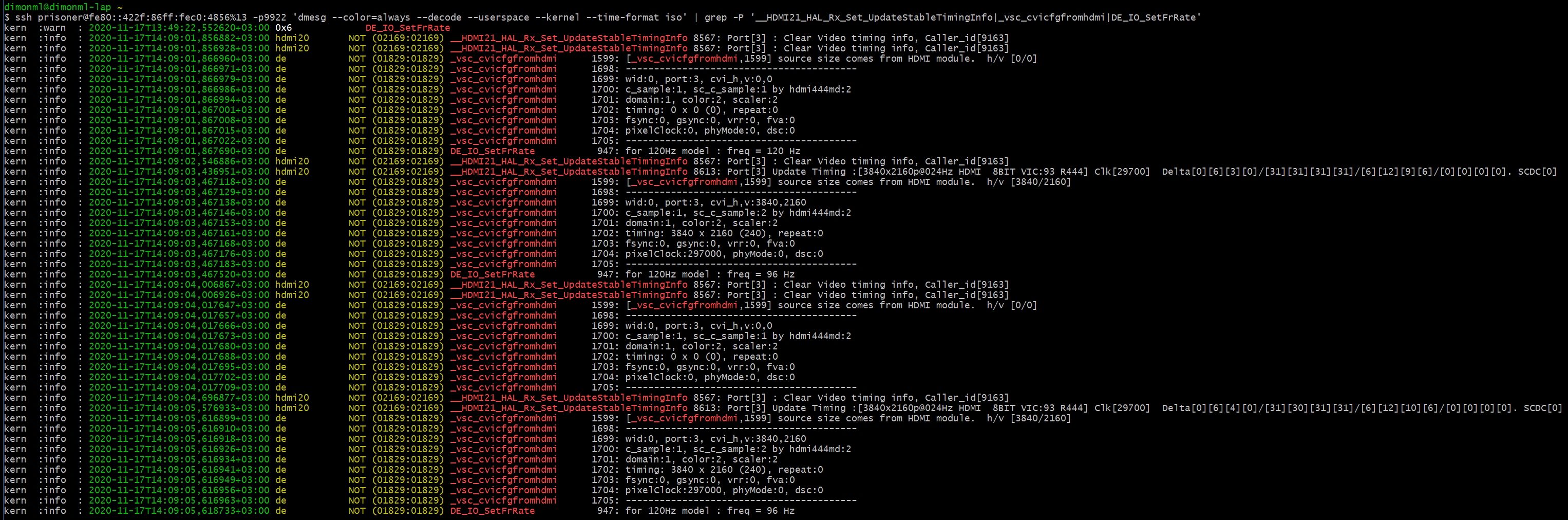 $ ssh prisoner@fe80::422f:86ff:fec0:4856%13 -p9922 'dmesg --color=always --decode --userspace --kernel --time-format iso' | grep -P '__HDMI21_HAL_Rx_Set_UpdateStableTimingInfo|_vsc_cvicfgfromhdmi|DE_IO_SetFrRate'