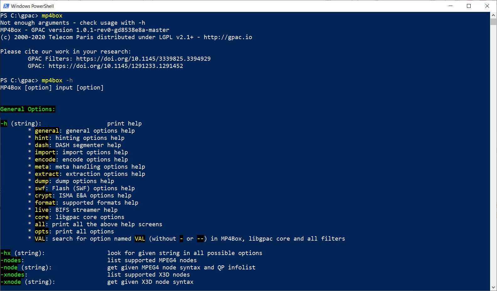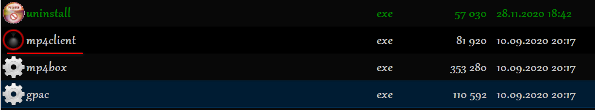 https://www.videohelp.com/software/MP4Box версию для своей ОС, установил, в папке с программой обнаружил несколько exe, запускается из них только тот что подчёркнут на скрине (uninstal не в счёт), но после запуска ввод команд с клавиатуры не работает. Если запустить просто так, то при нажатии любой клавише программа вылетает, если от админа, то не вылетает, но и ничего набрать невозможно (вставить из буфера тоже), другие exe просто на долю секунды запускаются и закрываются.