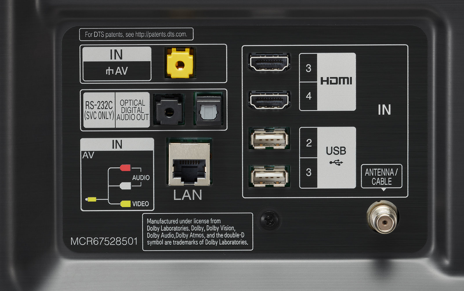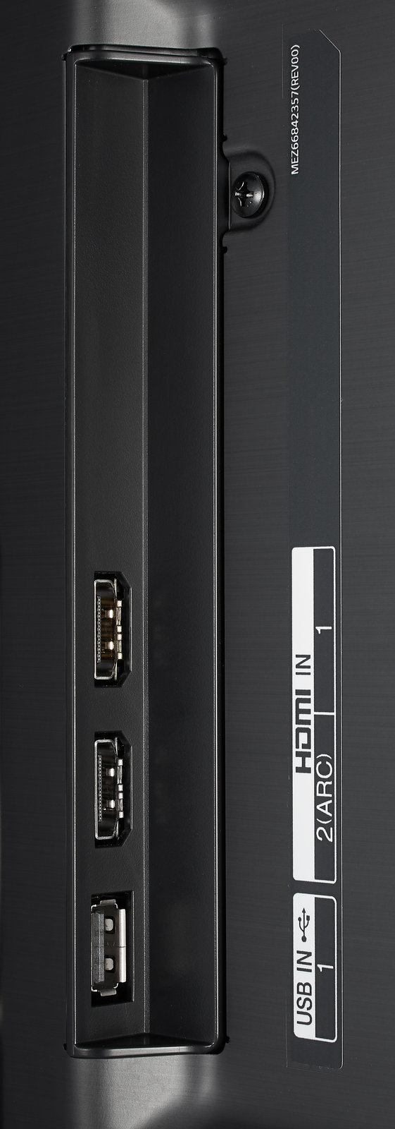 Задняя панель телевизора LG NANO81 оснащена следующими интерфейсами: два входа HDMI, 2 антенных входа (для спутникового и кабельного/эфирного ТВ), компонентный AV-вход (в версии для США), один порт LAN (со скоростью 100 Мбит/сек), один порт USB (версии 2.0). Что касается аудио, то на этой же панели расположен только оптический аудиовыход, выход 3,5" для наушников отсутствует.
