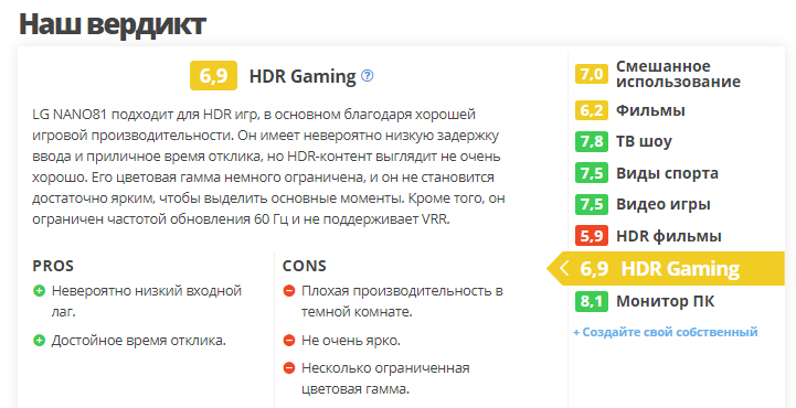 LG NANO81 - приличный общий телевизор с IPS-панелью. Это очень простой телевизор, который ограничен дополнительными функциями, поскольку он не поддерживает технологию с переменной частотой обновления (VRR) или Dolby Vision. У него широкие углы обзора, поэтому это хороший выбор для просмотра большой игры с большим количеством друзей. К сожалению, люди, которые любят смотреть фильмы в темноте, могут быть разочарованы его низким коэффициентом контрастности, плохой функцией локального затемнения и проблемами однородности. Это хороший выбор для консольных геймеров, потому что время отклика приличное, а задержка ввода невероятно мала. В целом, это довольно хорошо сложенный телевизор с отличным дизайном и превосходной подставкой в ??центре.