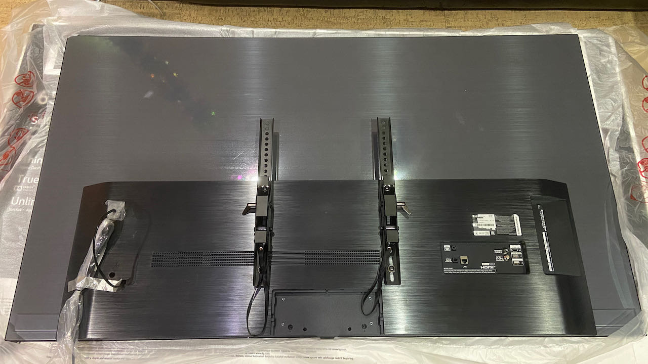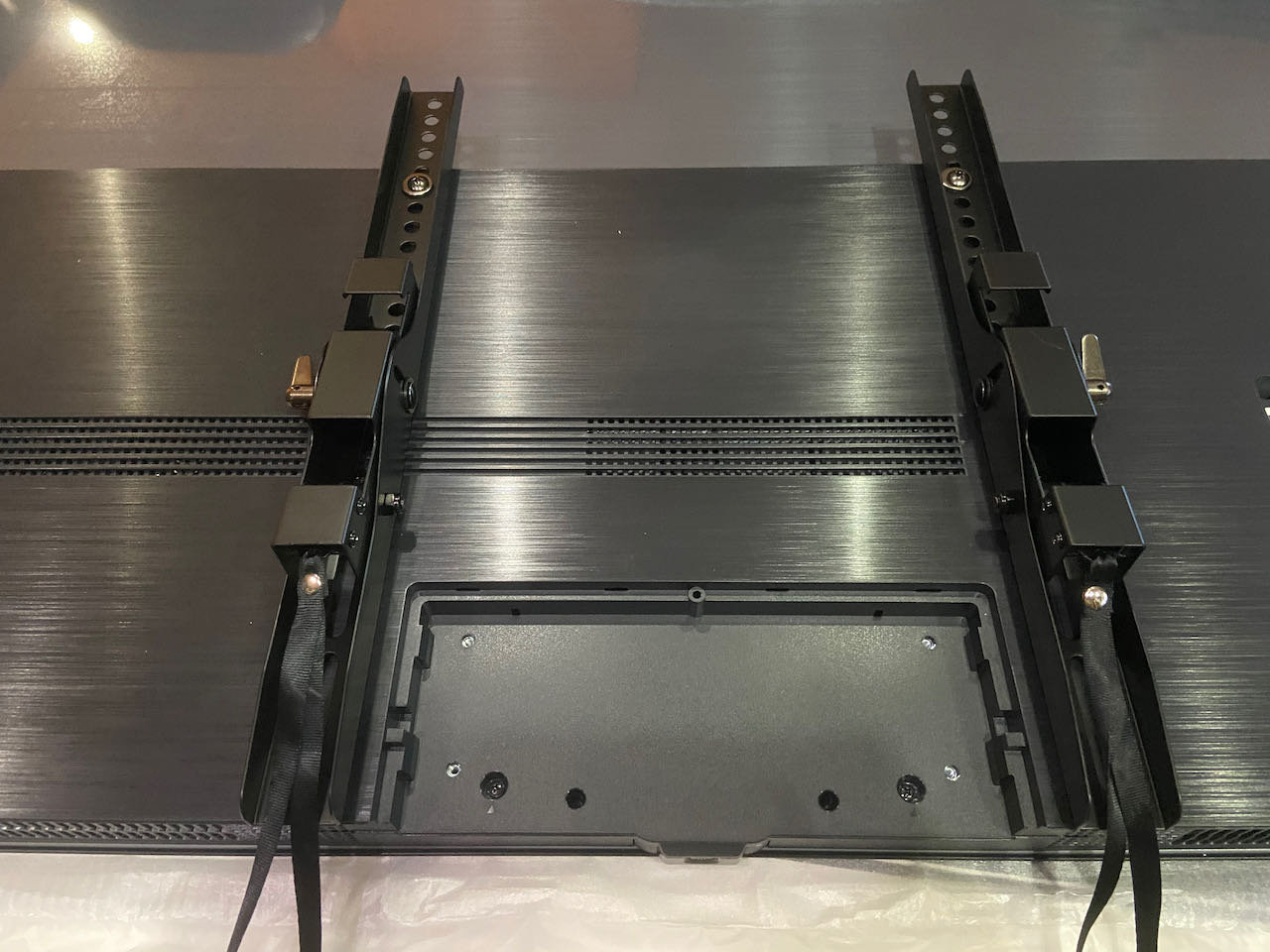 Кабели подключал на висящем ТВ, лучше, конечно, все подключить до навешивания на рамку, если Вам так удобнее. Фиксирующие панель собачки открываются при помощи лямочки на каждом из элементов кронштейна. Висит надежно. Рекомендую!