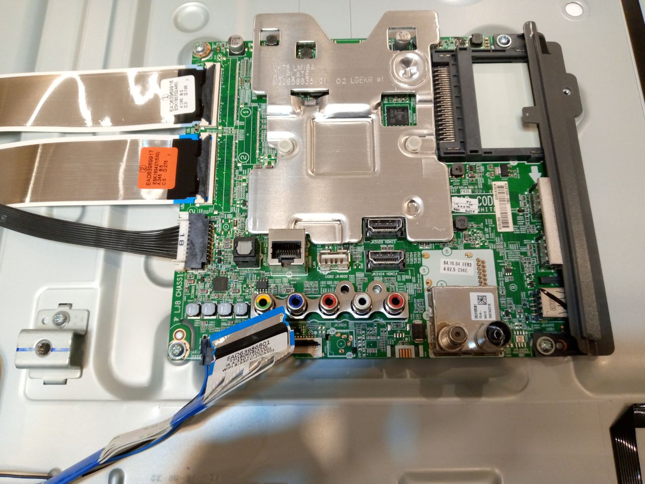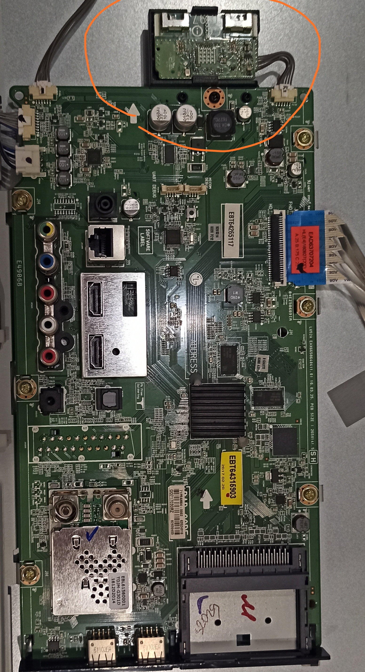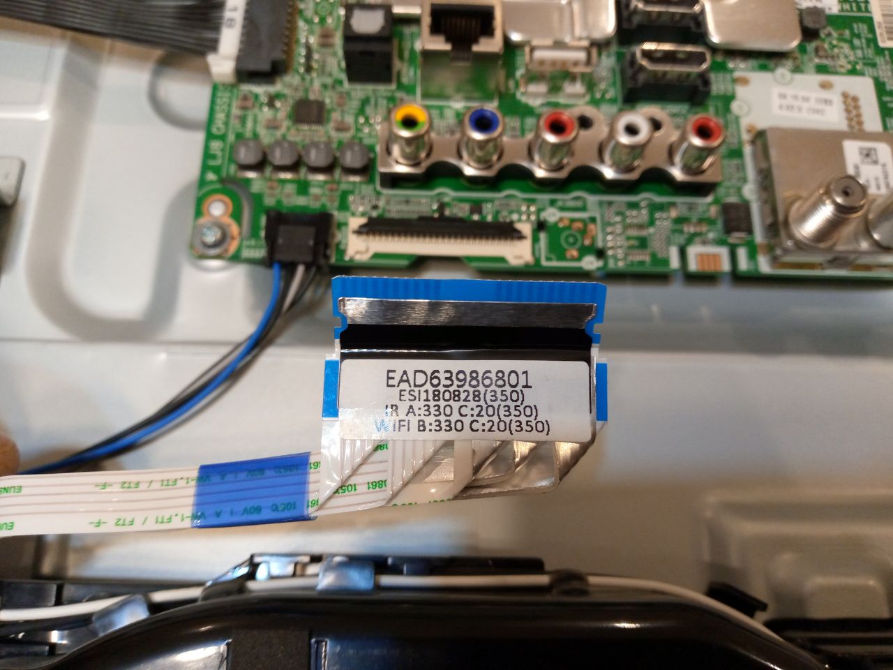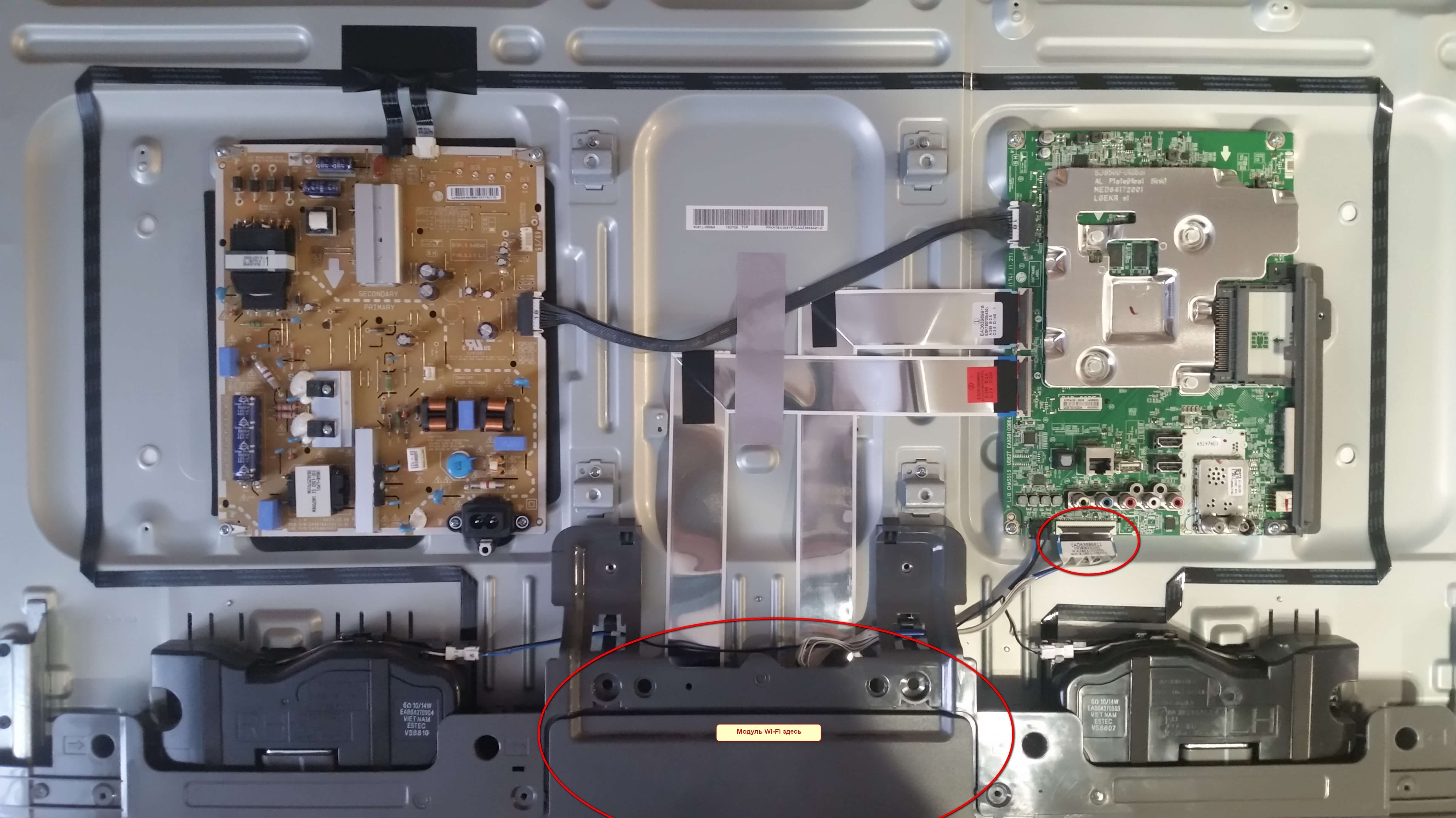 Как решил проблему. (Спасибо форуму). Снял крышку телевизора. Сбоку на плате - нашел файфай модуль. Фото прилагаю. К плате маленький коротенький проводок. Снял этот модуль - сдул пыль, протер тряпочкой. Провод повернул на 180 градусов. Всё собрал в обратном порядке. Также немного разогнул с двух сторон Шлейф, который идёт на матрицу (на всякий случай). Со стороны платы передёрнул шлейф. Сверху не понял как это делается, но чуть пошевелил. Собрал обратно телевизор обратно.