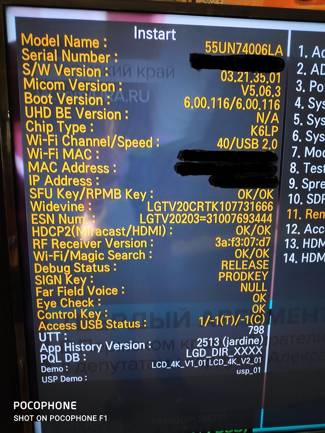 Алекс Питер писал(а):Подскажите, как Вы заходили в сервисное меню? У меня модель ТВ почти такая же. Увы, не получилось. У меня обычный простенький стандартный пульт в комплекте, а не навороченный. И на флэшке ТВ видит только фото и видео файлы. Что касается ошибки тестирования Wi-Fi, попробуйте посмотреть настройки роутера, может быть ошибка из-за него. Может имеет смысл изменить частоту (если их две). Тут тонкостей может быть много. Все знать и предвидеть невозможно.