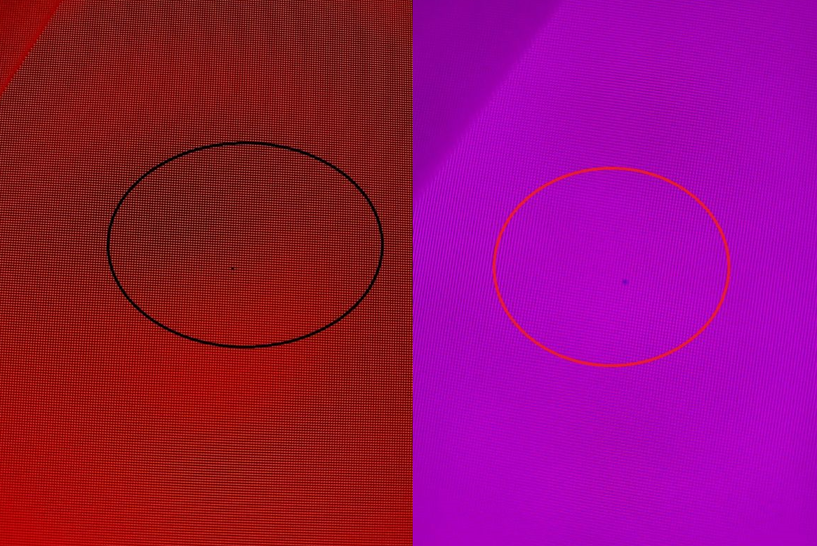 Ссудя по вашему ответу у Вас горит красный суббпиксель при выклбченных остальных (черный фон) и вероятно ДОЛЖЕН гореть при работающих зелены\синием\белом. На прошлой странице есть фото как выглядить НЕ горящий целый пикслей на 4 цветах.
