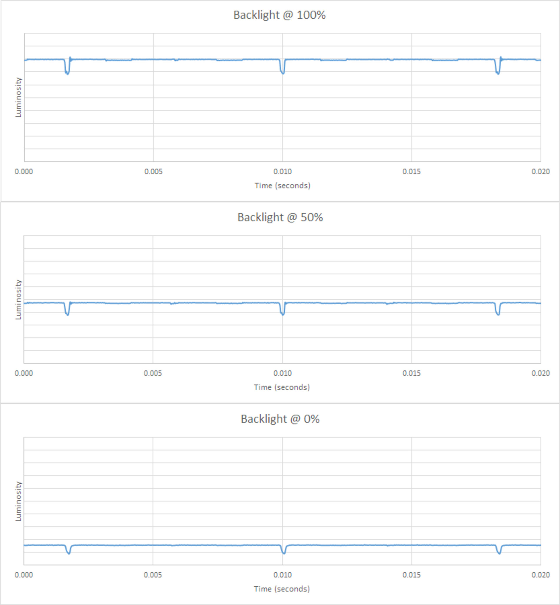 LG B9 не использует ШИМ для затемнения экрана. Это помогает движению выглядеть более плавным, но приводит к некоторому постоянному размытию. Небольшое падение яркости, которое вы видите на графиках, появляется каждые 8 ??мс и совпадает с частотой обновления телевизора. Это не должно быть заметно.