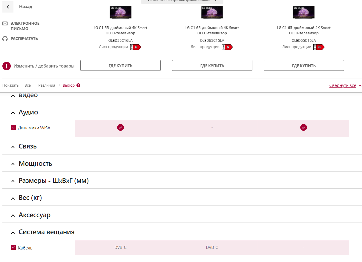 Сомнительно (вероятно технические недоработки на сайте), т.к., например, для 55" это уже естьAlexMaestro писал(а):выдает, что нет в OLED65C16LA кабельного телевидения DVB-C.