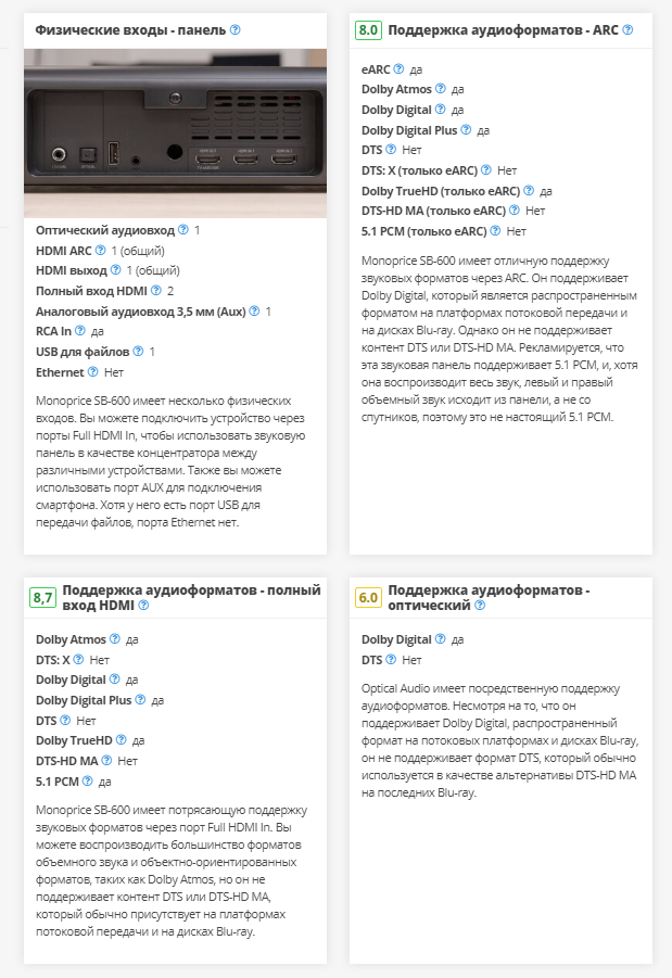 Немного пересобрал рейтинговую (с точки зрения использования на кинематографическом звуке) таблицу в помощь на первоначальном этапе определяющимся с саундбаром в этих целях. Сформирована и стоит использовать с учетом следующих принципов и допущений: 1) Включены лишь наиболее значимые в аспекте использования на кинотеатральном звуке параметры; 2) Основным критерием расстановки в рейтинге избрана итоговая оценка по категории Кино. Оценка по категории Диалоги/Шоу включена лишь, как имеющая значение как с точки зрения эпизодов с диалогами/монологами героев в кадре, так и возможности использования этого же сетапа при просмотре в вещательном сценарии; 3) В ранжировку включены лишь аппараты со схемой реализации каналов озвучивания от 3.1 (при этом 4.0 и 5.0.2 исключены либо как не имеющие перспективности, либо как избыточные, для которых рассмотрены доукомплектованные варианты): 4) Рассматривающие исключительно ТВ с его возможностями в качестве источника получения звука из медиаконтента (без отдельного внешнего источника) смело пропускают/удаляют позиции, относящиеся к поддержке ко всем форматам HD-звука по любым входам, а также по наличию/количеству полных HDMI-входов; 5) Оценки объемности звучания и высоты Атмоса введены для самостоятельного перебора в зависимости от личных предпочтений того или иного аспекта; 6) Позиции по объему 7.1 и локализации высоты введены для получения представления о том, каким образом будет звучать исходный 7.1-канальный звук (как есть/задуман/закодирован, или с миксированием surrond и back каналов в один источник звучания) и каким образом будет формироваться звучание сверху в Атмос-звуке; 7) Из функций улучшений отмечена лишь возможность/ (отсутствие таковой) автоматической подстройки/калибровки под помещение; 8) После позиции количества полных HDMI-входов сгруппированы показатели по поддержке всех основных возможных в кинематографическом контенте форматов звука. Лица, упомянутые в п.4), снова проходят мимо и переходят к п.9) ; 9) Позиции наличия HDMI-выхода и HDMI ARC сопоставлены для наглядности случаев, когда это разъем используется исключительно для реализации соединений по звуку; 10) После позиции HDMI ARC отмечается наличие расширенных возможностей eARC у этого разъема, а далее сгруппированы показатели по поддержке по ним всех основных возможных в кинематографическом контенте форматов звука по этому интерфейсу. Лица, упомянутые в п.4), им и руководствуются в части относящейся; 11) Для совсем дремучих случае и/или вариантов технических накладок введена информация о наличии оптического аудиовхода и поддерживаемых по нему форматах многоканального звука. Пользуйтесь, кому есть необходимость Сейчас "великолепная пятерка" по такому рейтингу выглядит так