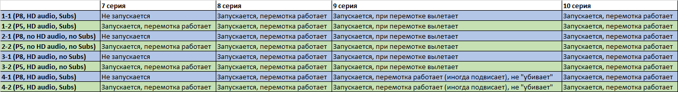 1-1, 1-2, 2-1, 2-2, 3-1, 3-2 Запускаются в DV, при нажатии пауза, далее плэй, всё нормально, при смене звуковой дороги и субтитров всё нормально. При перемотке вылетает. Иконка становится битая. Далее происходит какая-то ерунда. Битая иконка потом может запуститься, может нет. От чего это зависит непонятно. Битые иконки после очередного корректного запуска самовосстанавливаются. Так повторяется несколько раз. Затем наступает момент когда битые иконки перестают запускаться ВООБЩЕ. (что за дичь происходит??? )
