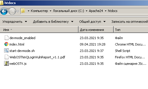 c файлам Apache24 в папку c:\apache24\htdocs. При вопросе замещать, соглашаемся. При проверке на компьютере, вместо It work! , у вас будет запускаться рабочая программа получения root, далее ее надо будет вызвать с ТВ в системном приложении с правами root, чтобы произошла подмена стартового скрипта в ТВ. А теперь подробнее это действие. Шаг 2 а) Копирует содержимое архива Apache24.zip (разжали и скопировали) в папку c:\Apache24 В результате получим в папке Apach24/htdoc
