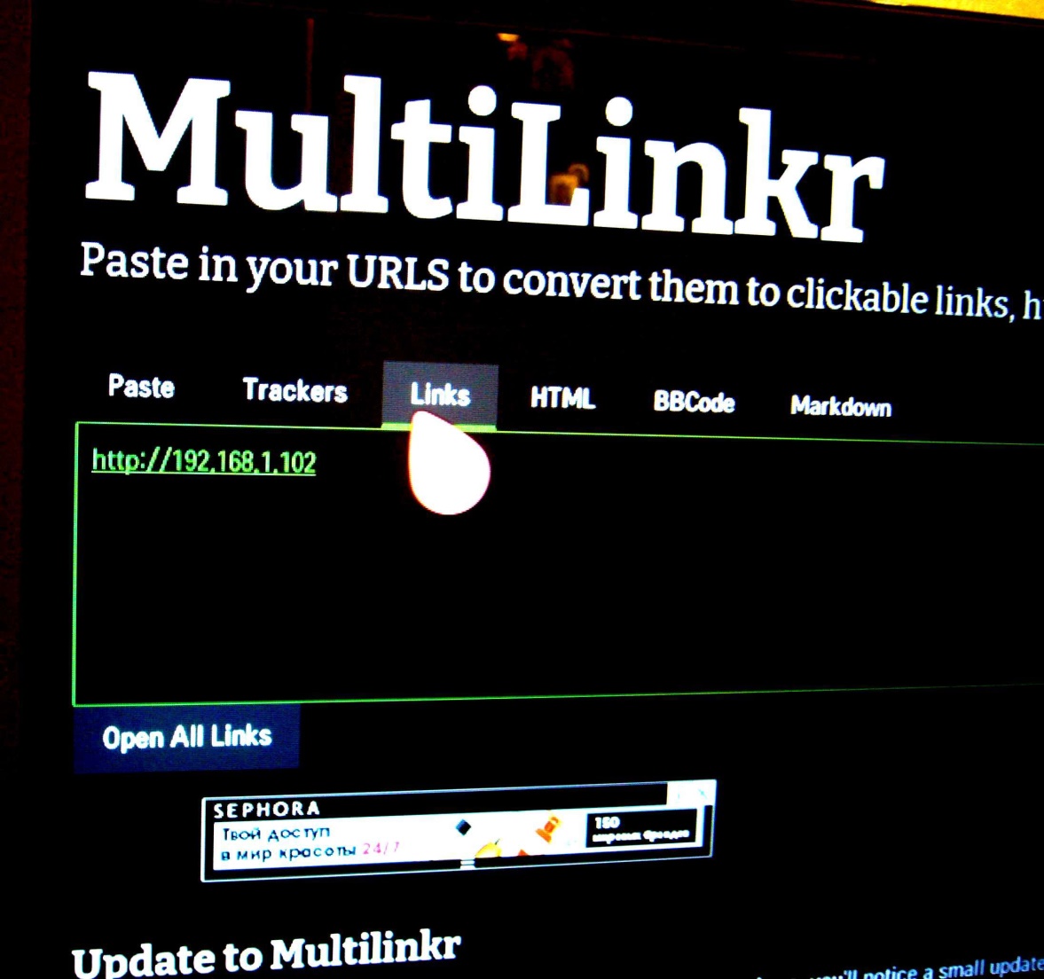 12. В multilinkr в разделе Paste вводим адрес вашего компьютера, где запущен Apach24 (из Шаг 1 и Шаг 2) у меня это 192.168.1.102 у вас будет другой. Если вы не выполняли Шаг 1 и Шаг 2 (т. е. не разворачивали апач у себя на компьютере), вводите адрес http://193.124.66.86, где все уже настроено.