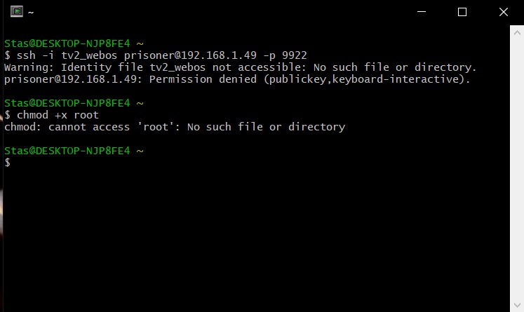 Я через Cygwin сначала получил файл с ключом командой wget http://192.168.х.хх:9991/webos_rsa, а затем соединялся с ТВ по команде ssh -i./webos_rsa prisoner@192.168. х. хх -p 9922 '/bin/sh -i', где -i./webos_rsa есть ссылка на ранее полученный файл.