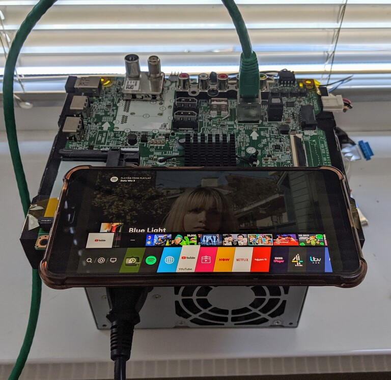 Демонстрация работы на материнской плате телевизора без матрицы, доступ к VNC-серверу осуществляется через мобильное приложение VNC.