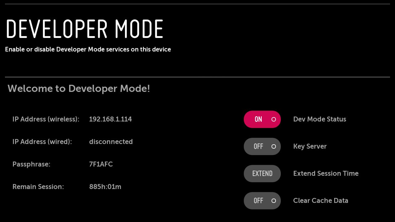 luna-send -n 1 -f luna://com.webos.surfacemanager/captureCompositorOutput '{"output":"/home/root/screenshot-temp.jpg", "format":"JPG"}'luna-send -n 1 -f luna://com.webos.surfacemanager/captureCompositorOutput '{"output":"/tmp/usb/sdb/sdb/foto1.jpg", "format":"JPG"}'luna-send -n 1 -f luna://com.webos.surfacemanager/getForegroundAppInfo '{}'luna-send -n 1 -f luna://com.webos.service.wifi/findnetworks '{}'luna-send -n 1 -f luna://com.webos.service.wifi/getstatus '{}'luna-send -n 1 -f luna://com.webos.service.systemservice/deviceInfo/query '{}'luna-send -n 1 luna://com.webos.service.webappmanager/getWebProcessSize '{}'luna-send -n 1 luna://com.webos.service.webappmanager/listRunningApps '{}'luna-send -n 1 luna://com.webos.service.webappmanager/clearBrowsingData '{"types":["all"]}'luna-send -n 1 luna://com.webos.service.webappmanager/clearBrowsingData '{}'luna-send -n 1 luna://com.webos.service.webappmanager/clearBrowsingData '{"types":["localStorage"]}'luna-send -n 1 -f luna://com.webos.service.pdm/getSpaceInfo '{"driveName": "