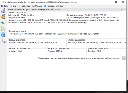 Выложите в текстовом виде информацию по дорожкам в файле фильма, выдаваемую программой Mediainfo.