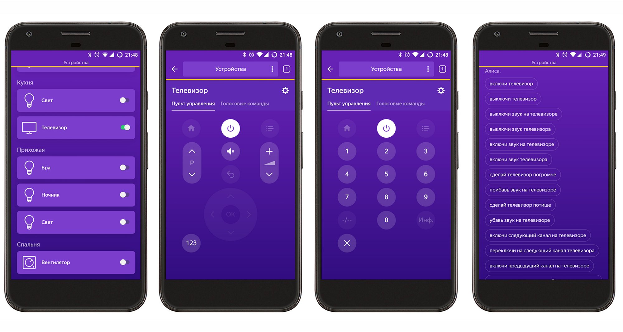 - Обновляем список устройств в приложении Яндекс, после чего на главной странице приложения появится новое устройство. Вкладка Пульт управления предоставляет виджет управления устройством, внешне аналогичный ИК-пульту дистанционного управления. Вкладка Голосовые команды отображает примеры возможных голосовых команд управления устройством. В настройках можно переименовать устройство, переназначить комнату, добавить его в группу, посмотреть дополнительную информацию и удалить из приложения.
