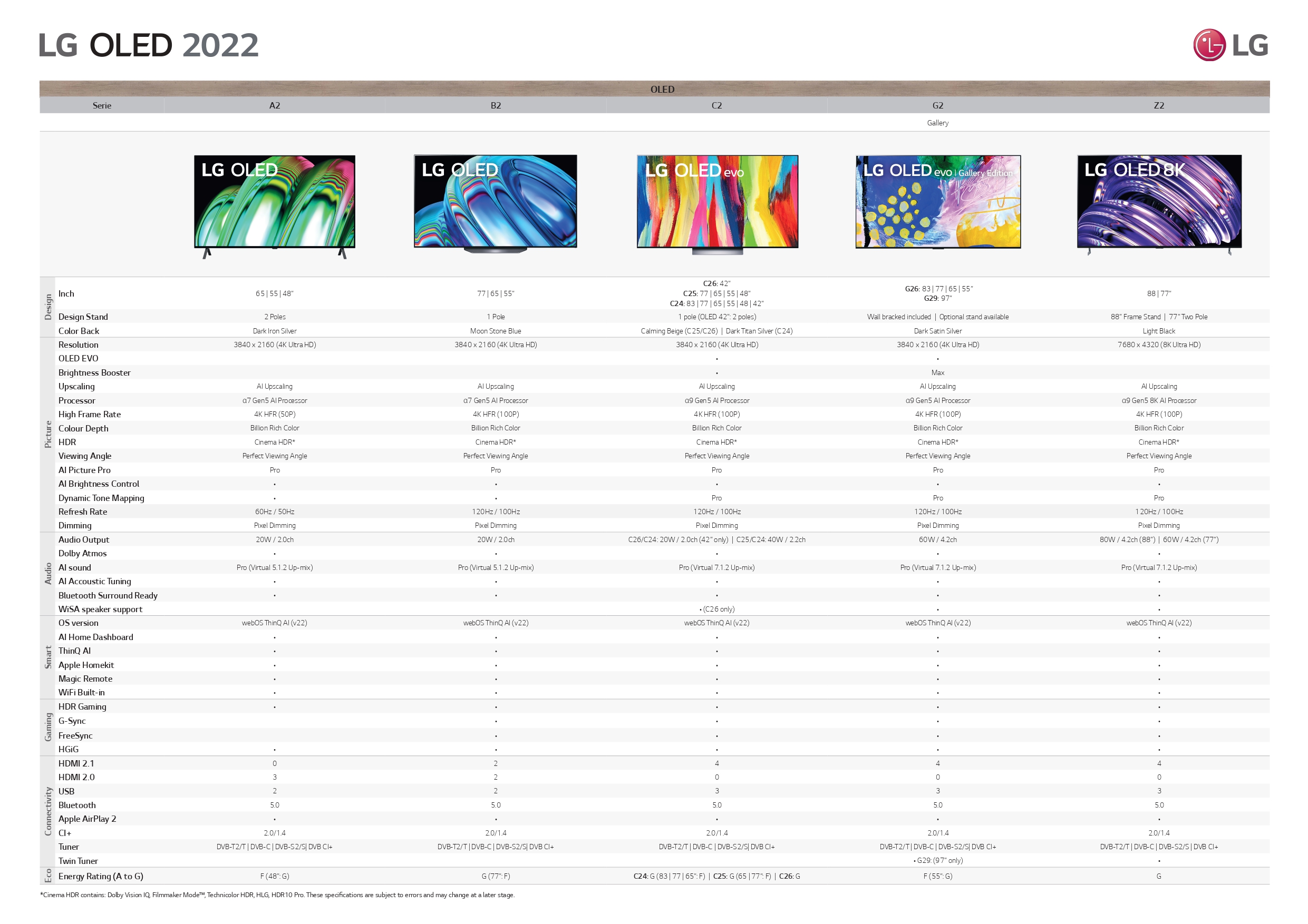 Фирменная сравнительная таблица телевизоров LG OLED 2022 года: