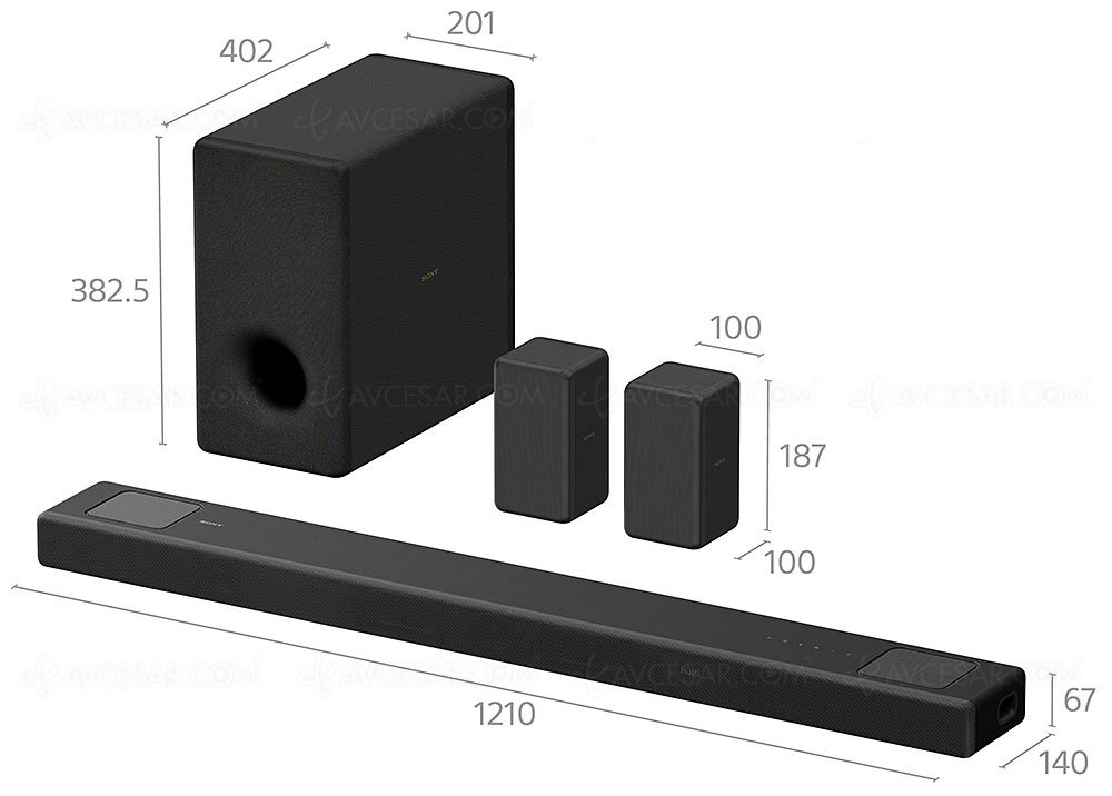 Модель Sony HT-A5000 представляет собой звуковую панель 5.1.2, которая может быть значительно улучшена благодаря добавлению пары компактных беспроводных динамиков объемного звучания Sony SA-RS3S, а также дополнительному беспроводному сабвуферу Sony SA-SW3. (мембрана 160 мм и мощность 200 Вт, см. первое фото ниже) или Sony SA-SW5 (мембрана 180 мм и мощность 300 Вт, см. второе фото ниже).