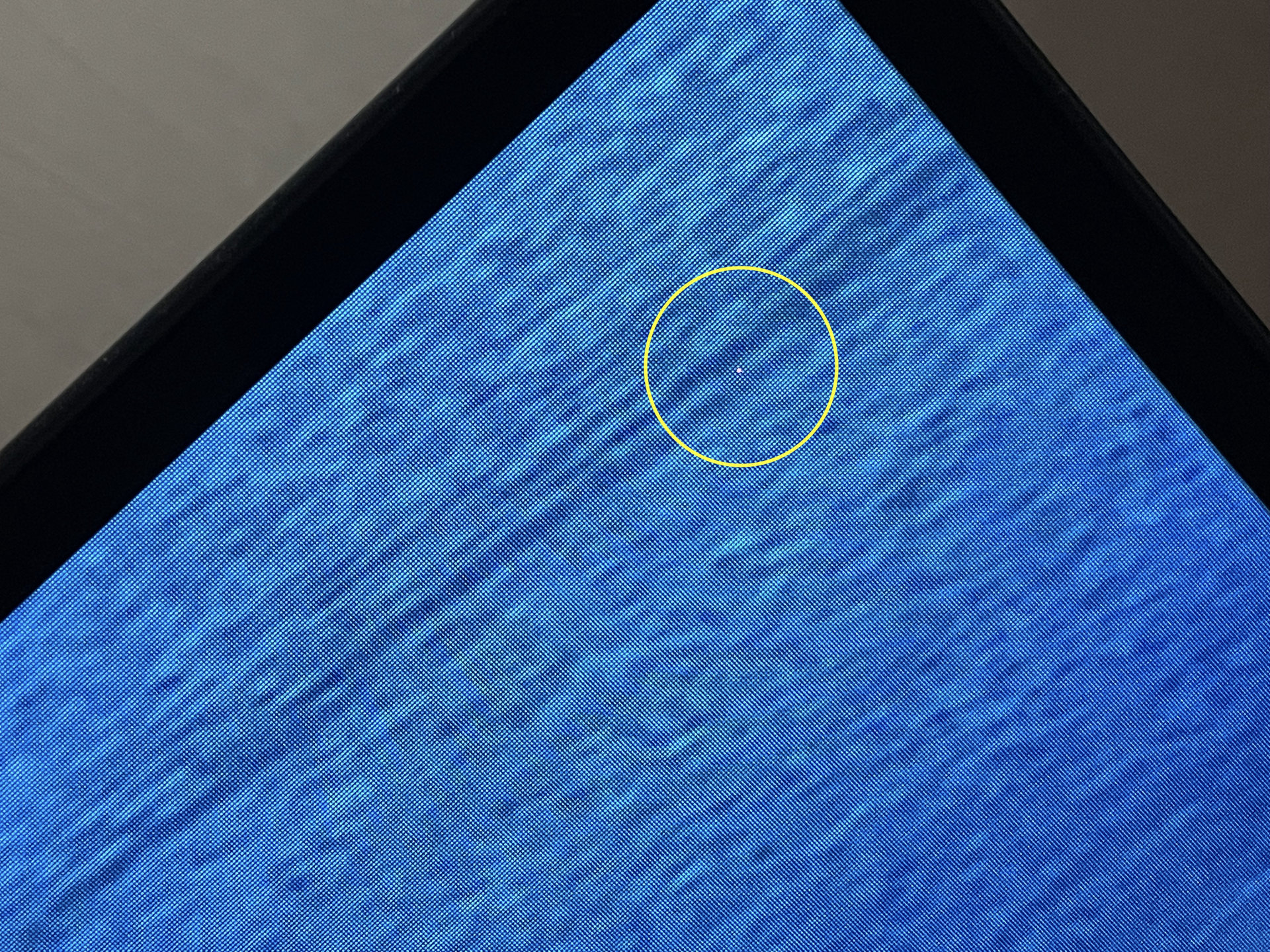 Здравствуйте, подскажите, пожалуйста, что это за артефакт? Если я правильно думаю, что это битый пиксель, то к какому типу относится, к яркому? Не хотелось обращаться по гарантии, но похоже придётся из-за полосы и пикселя.