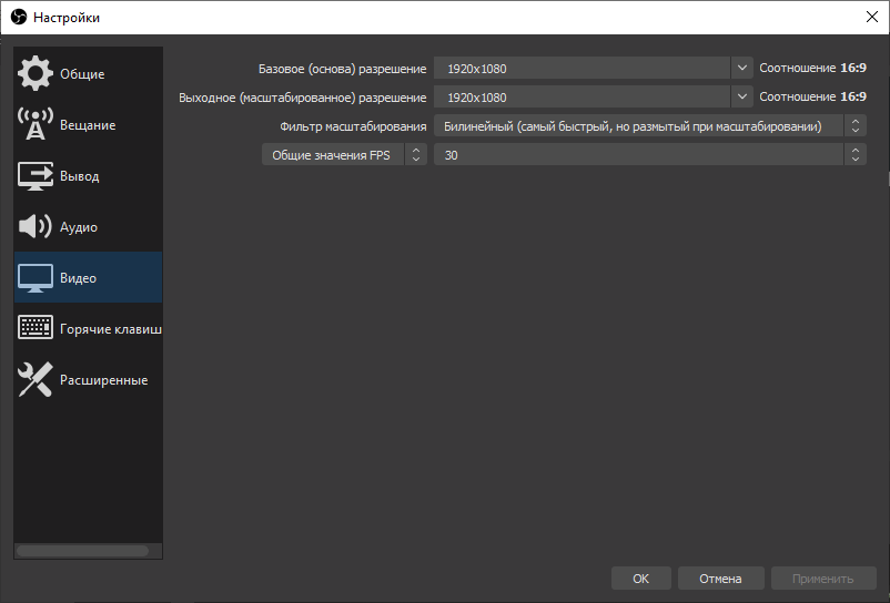 В настройках OBS Studio выставляем все так, как указано на этих скриншотах: