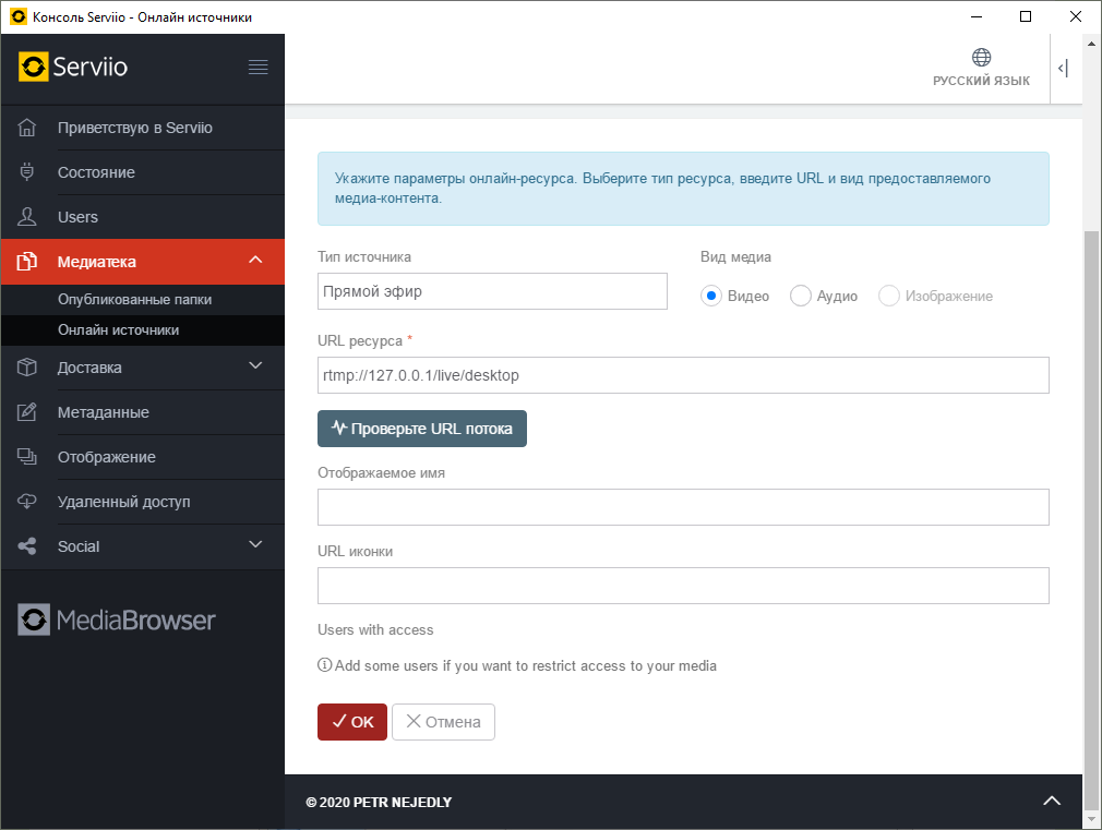 Serviio Media Streaming Server. Переходим в консоль управления и добавляем в медиатеку онлайн источников ссылку на наш RTMP поток. Здесь же можно протестировать работоспособность с помощью соответствующей кнопки.